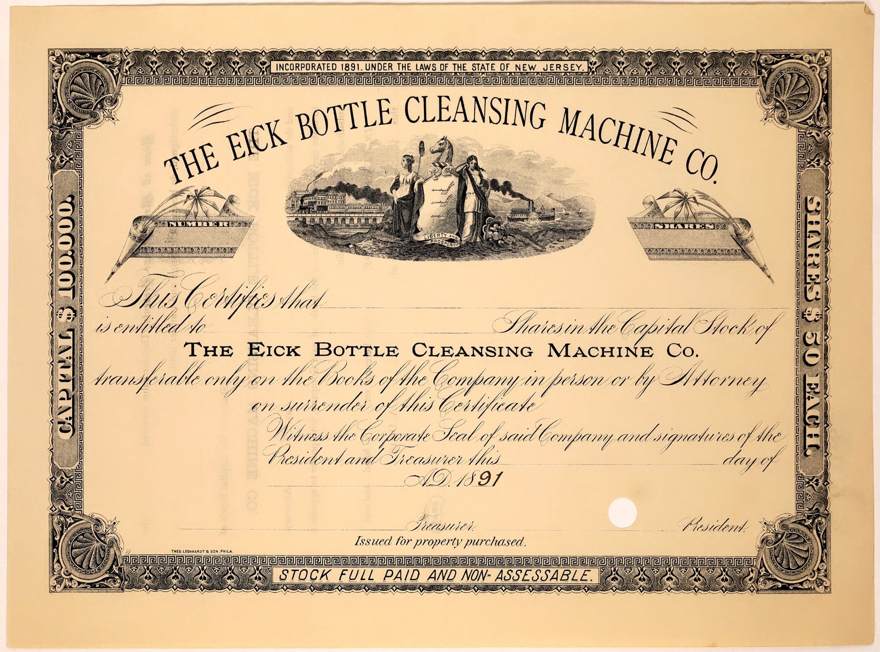 Unissued stock certificate from Eick Bottle Cleansing Machine Company. The vignette shows two Greek themed figures with a locomotive crossing a trestle in the background. It is dated 1891.