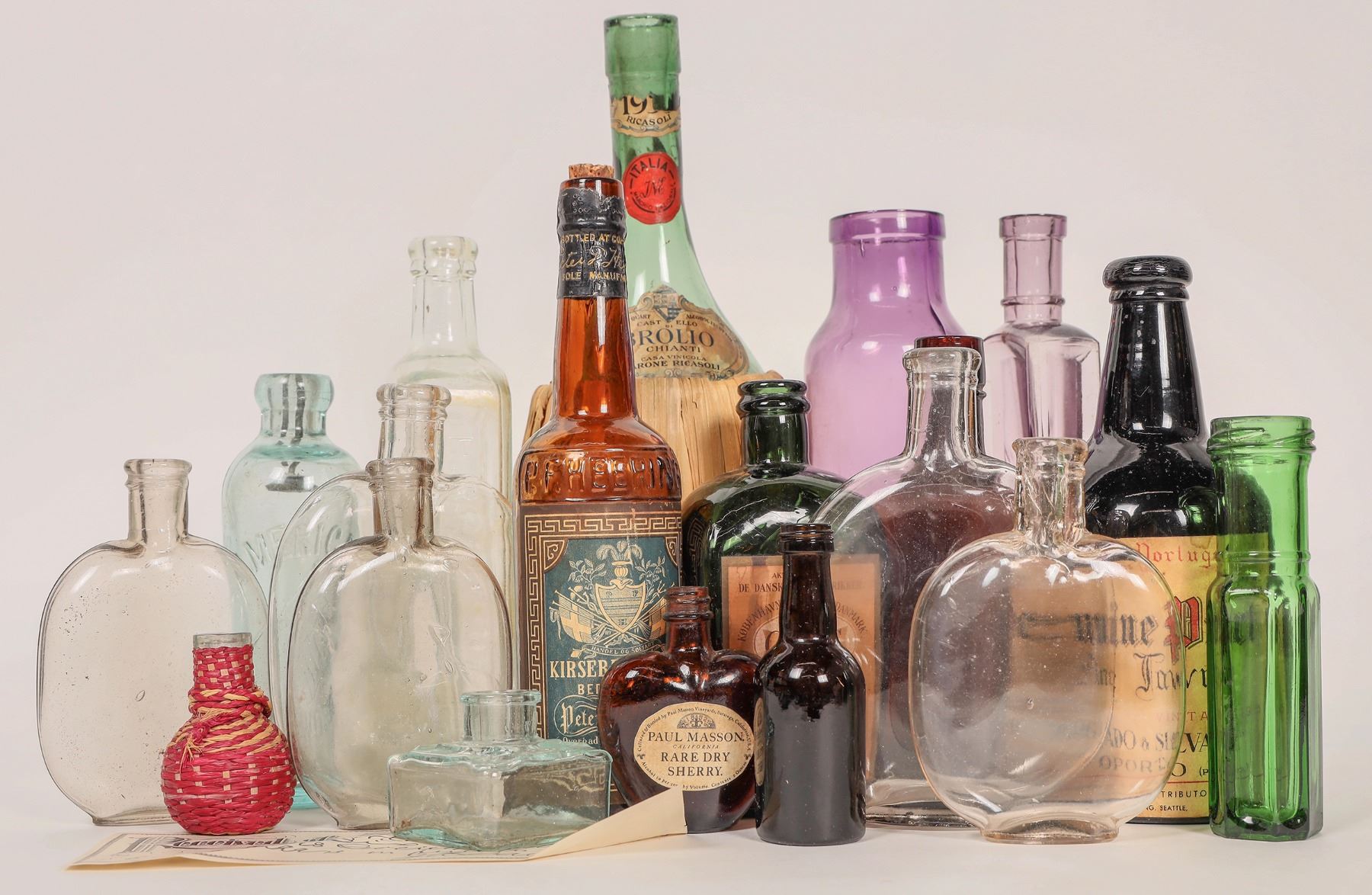 Nice mix of 14 bottles including 5 pumpkin seed whiskeys, 4 paper labels, Chianti fiasco, Austin, NV, amber 1925 Tawny Port etc. See photo.