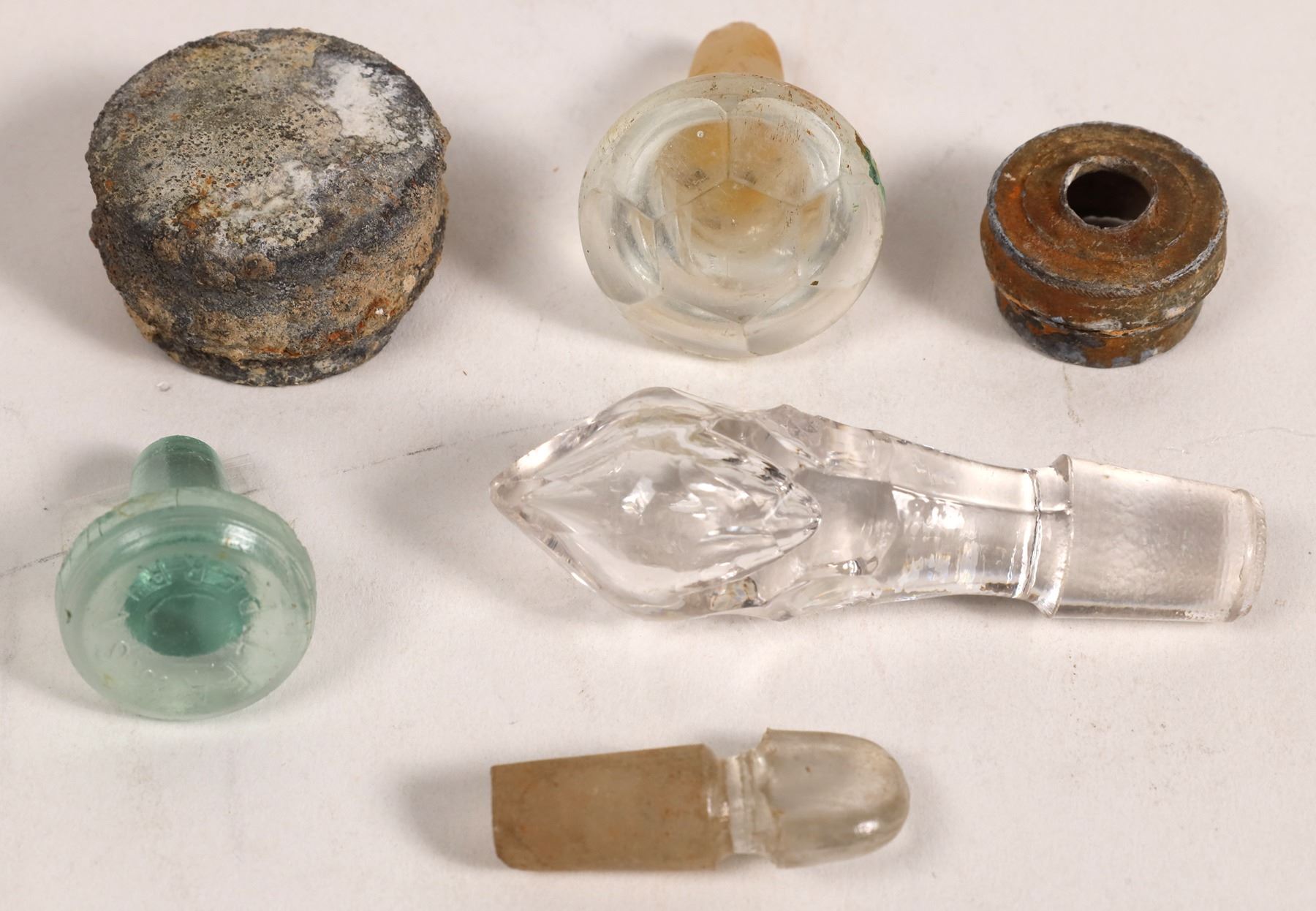1) Glass Bottle Stoppers. This group has four glass bottle stoppers. The large clear one has a leaf and fern style; a smaller aqua stopper was made for Lea & Perrins (known for making Worcestershire Sauce in the UK). A small clear stopper is a perfume bottle stopper. One large stopper was made for a perfumed water bottle. It may have been customary of the period to use perfumed water in place of a bath when access to hot clean water may not have been available. Living aboard ship also has limitations. 2) Lead bottle cap without visible marking. Center indent and tapered bottom. About 1x1.5". 3) White metal bottle top, possibly used on a nursing bottle. Knurled pattern on top rim for gripping. Upper tip degraded. 5/8x1".