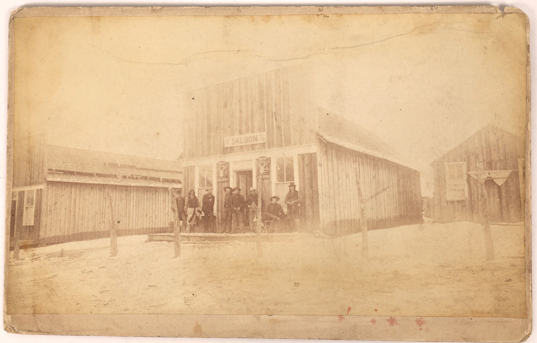 Photo shows eight men posing in front of a wooden building that has a sign above the door that says "Saloon." It also has two signs on either side that read "Denver Brewing Company, Lager Beer." Two of the men appear to be Native Americans. The card has pencil notations on the reverse (from late collector Ron Lerch) that identify this as Creede, Colorado. No photographer listed. Chips, stains, heavy creases, and other wear. Please inspect. 5 x 8"