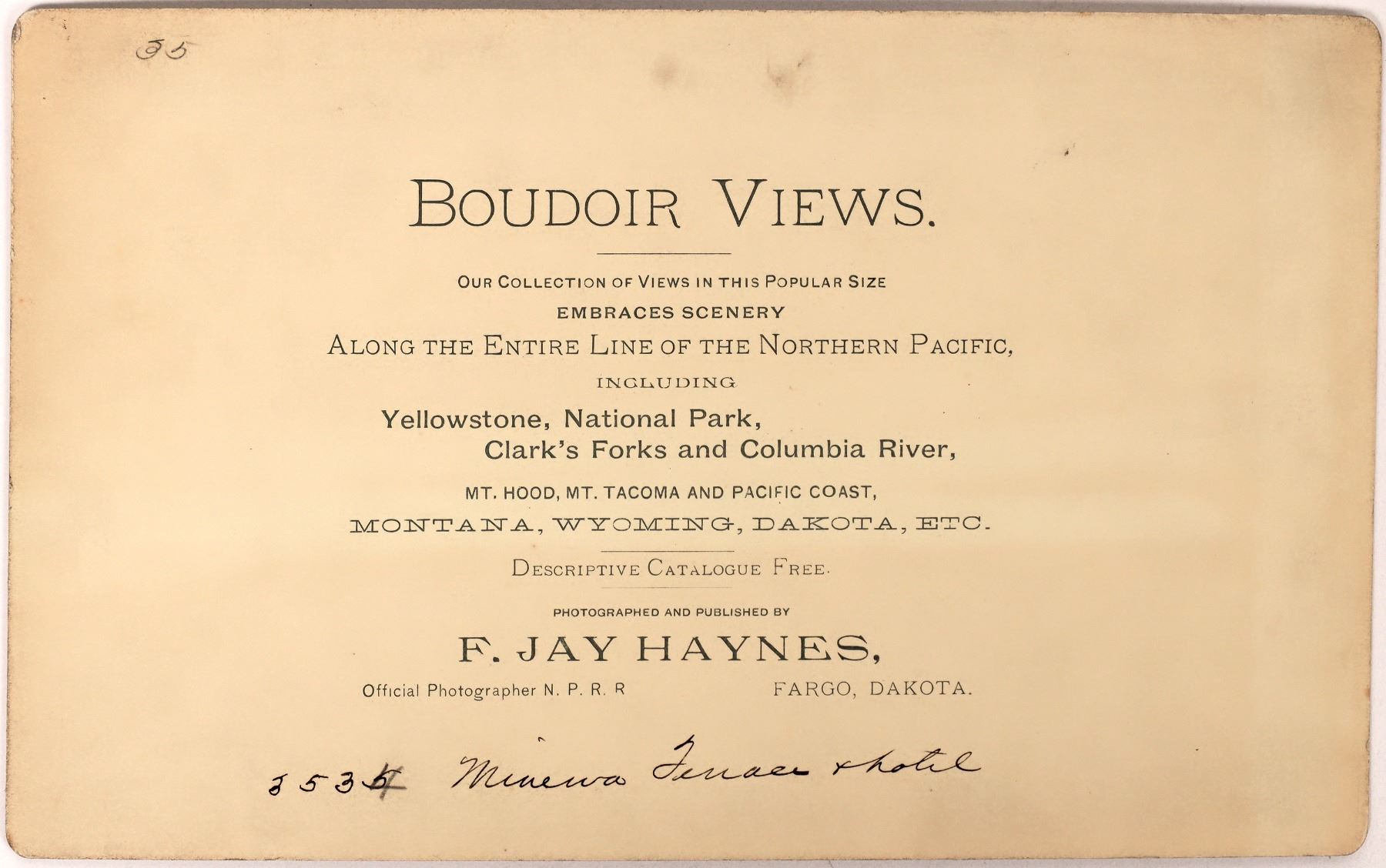 Boudoir View photo by F Jay Haynes, #3534, Minerva Hotel and Terrace. Photo series along the Northern Pacific. 5x8.5".