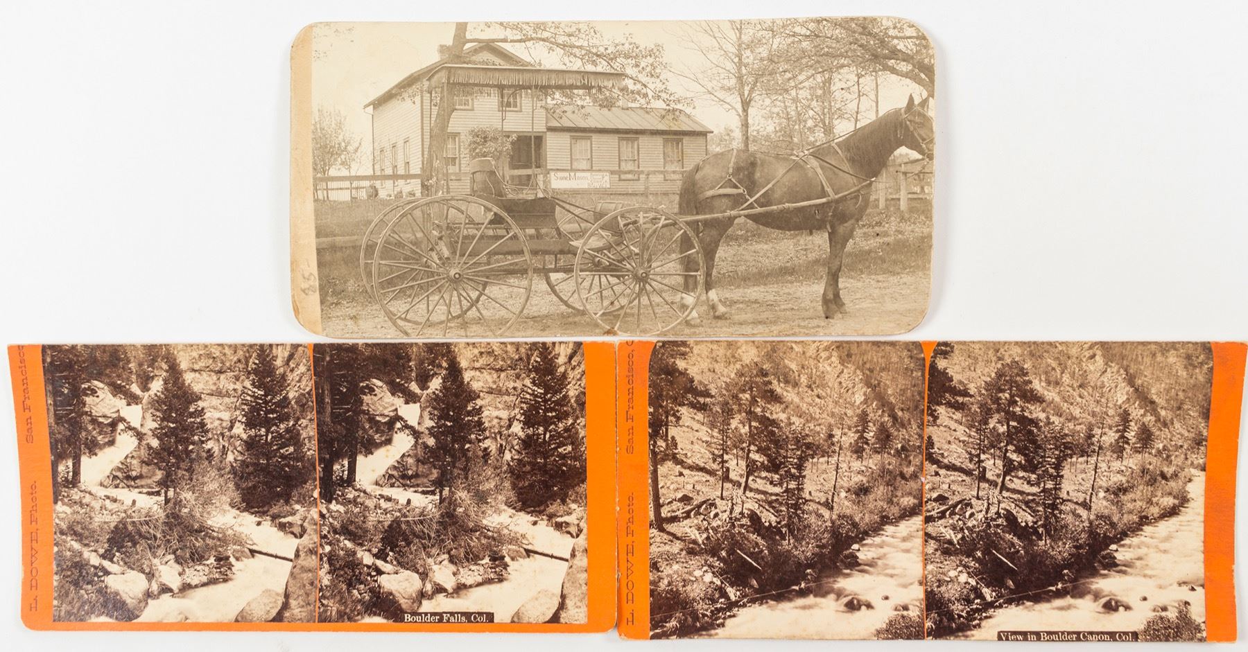3 stereoviews; four views. Football players in the street near Walnut House by uncredited photographer, horse and carriage. Boulder Falls and Boulder Canyon by L. Dowe.