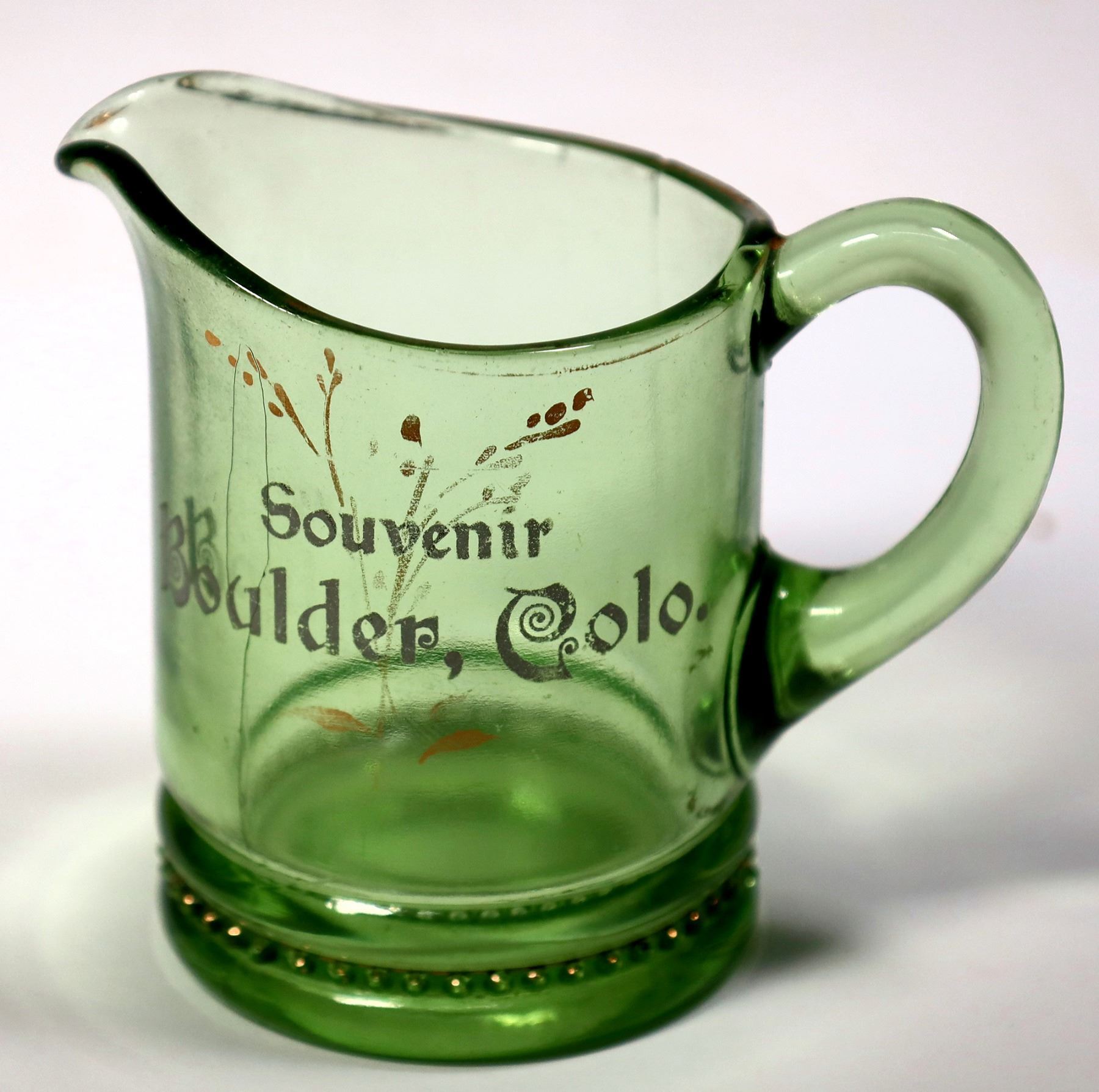 Small antique souvenir glass (creamer?) for Boulder. White etched lettering, " Souvenir / Boulder, Colo." Gilt floral pattern. Glass has a greenish tint. No other markings. Crack on back near handle. 2.75"H x 2"W. Please inspect.