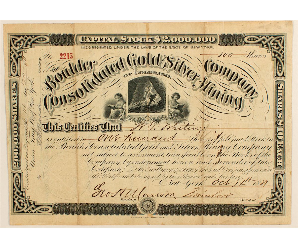 Inc. in New York, July 29th, 1879. No. 2215. Uncancelled. Issued for 100 shares to W. T. Whiting on Oct. 14th, 1881. Signed by Edwin Lord (president) and Geo. H. Morrison (secretary). Countersigned Union Trust Co. on the same day. Reverse is endorsed by Whiting. Central framed vignette of three men working underground, with two reading children on either side. Ornate border. Printed by Franklin Bank Note Co., New York. Company seal lower left. According to 1883 New York Supreme Court records, the company’s mines included “The Boulder County,” “The West Extension,” and “The Trojan.” Properties were located in the Grand View Mining District, Boulder County, Colorado. Measures 10” x 7.” Folds, toning, soiling and a few pinholes.City: BoulderCounty: BoulderState: CODate: 1879