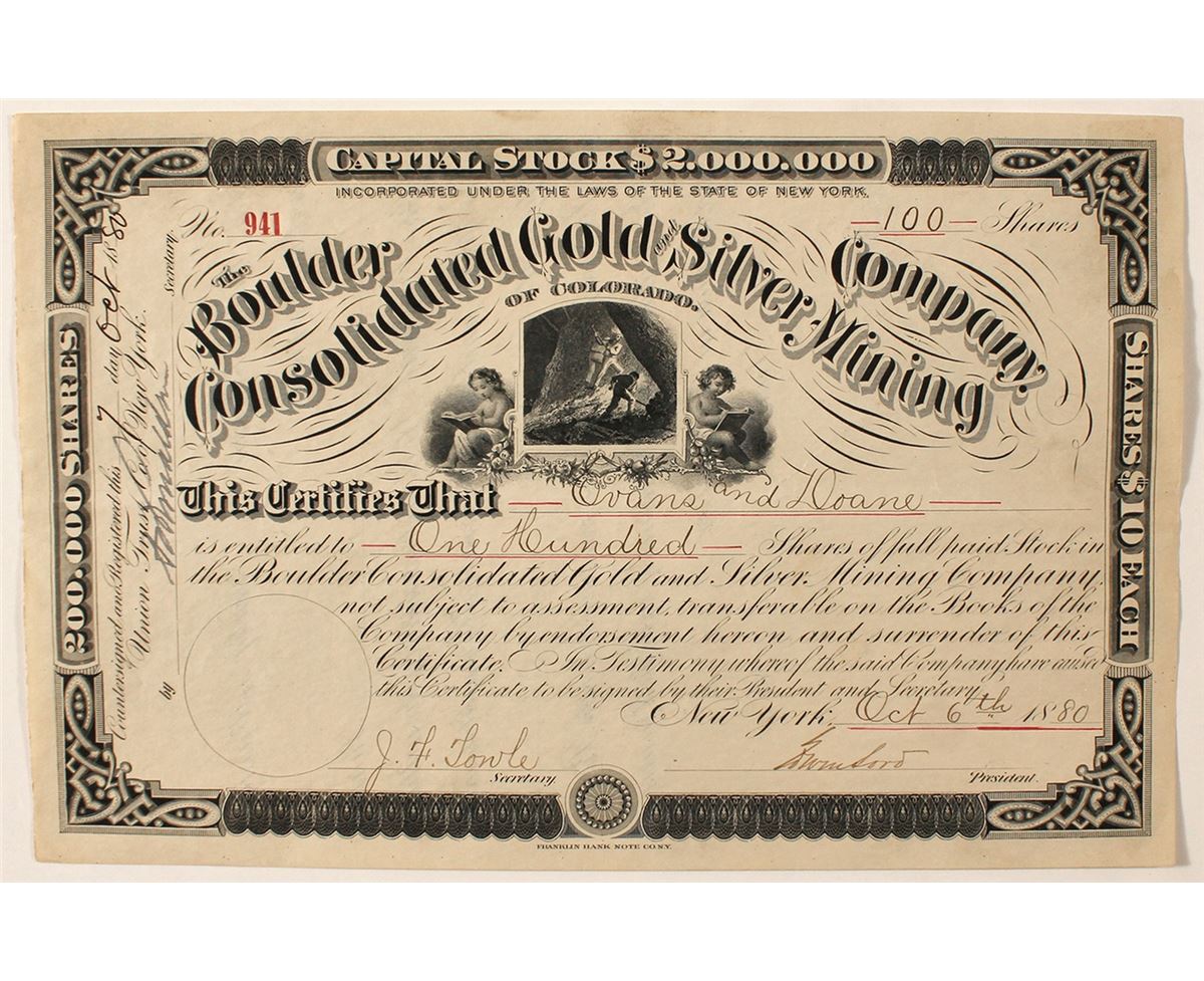 Incorporated under the laws of the State of New York. No. 941, issued to Evans and Doane for 100 shares dated October 6, 1880. Signed by J.F. Towle as Secretary. Printer: Franklin bank Note Co. N.Y. Vignette of underground mining scene with cherub sitting on each side. In 1883 the firm owned the Boulder Co., Trojan, Western Extension, Conger, Walden, Hamlin and Pendleton Lodes, at Cardinal in the Grand Island Mining District. In 1906 the property was located on Poorman Hill, about five miles west of the city of Boulder. The property consisted of the Gold Medal, the Mogul, and the No Name claims, and one mill. It was dissolved March 2, 1924. The Gold Medal vein was a large vein, 4 to 35' wide assaying at 0.5 oz./ton. The Mogul was a very large vein, nearly 50' wide, assaying at 0.3 oz./ton gold. The No Name vein was 6' wide and assayed at 0.68 oz./ton. The ore consisted of gold and silver tellurides. A large 150 ton cyanide mill was constructed to process the ore. Up to 1906, these mines produced 10,000 oz. gold. Veins all fissure from four to six ft. in width. Assays from 0.5 to 4 oz. gold and from 5 to 60 oz. silver. Developed by 900 ft. drifts and shafts; also owned a stamp mill situated in Nederland, containing 25 stamps and operated by water power for treating 25 tons per day.
