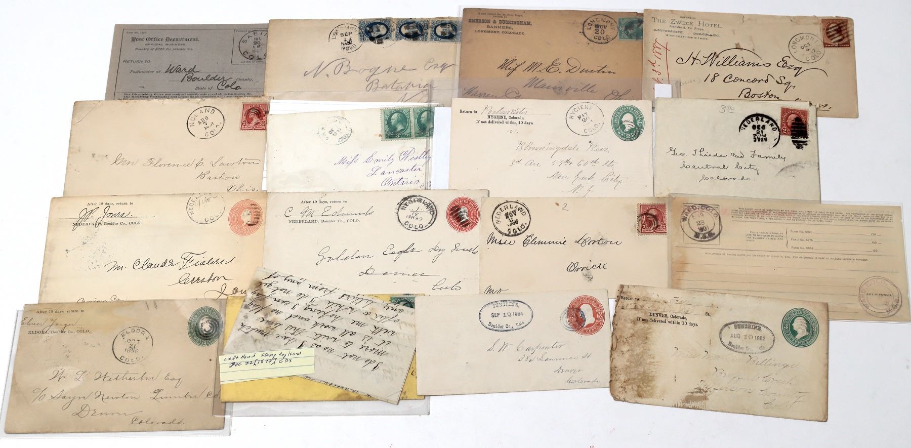 Lot of 16. 1) Lefthand cover with letter. December 1879. Letter has general news and mentions the powerful wind, including a stagecoach accident where the driver was killed. Cover has bold star killer. Left Hand PO operated 1872-1879. 2) Sunshine. Two covers, 1882 and 1884, both double oval with "teeth." 3) Eldora. Two pieces. Mining camp that is tough to find pieces from. 1898 corner cover for Yarger, and 1891 Postal Money Order card with Ward 1901 stamp. 4) Nederland. Four pieces: corner cover for CM Edmunds, 1899; 1890 cover; corner cover for JP Jones, 1900; and cover with holiday card, 1928. 5) Hygiene. Postmaster cover, 1894, with target killer. 6) Caribou. 1870s cover. Postmark not strong. 7) Noland. 1891 cover. 8) Longmont. Three pieces: corner ad cover for Zweck Hotel, 1887; corner ad cover for Emerson & Buckingham Bankers; and 1882 with three negative cross cancels. 9) Registry Bill postal card from Ward to Salina, CO. 1906. Salina postmark.
