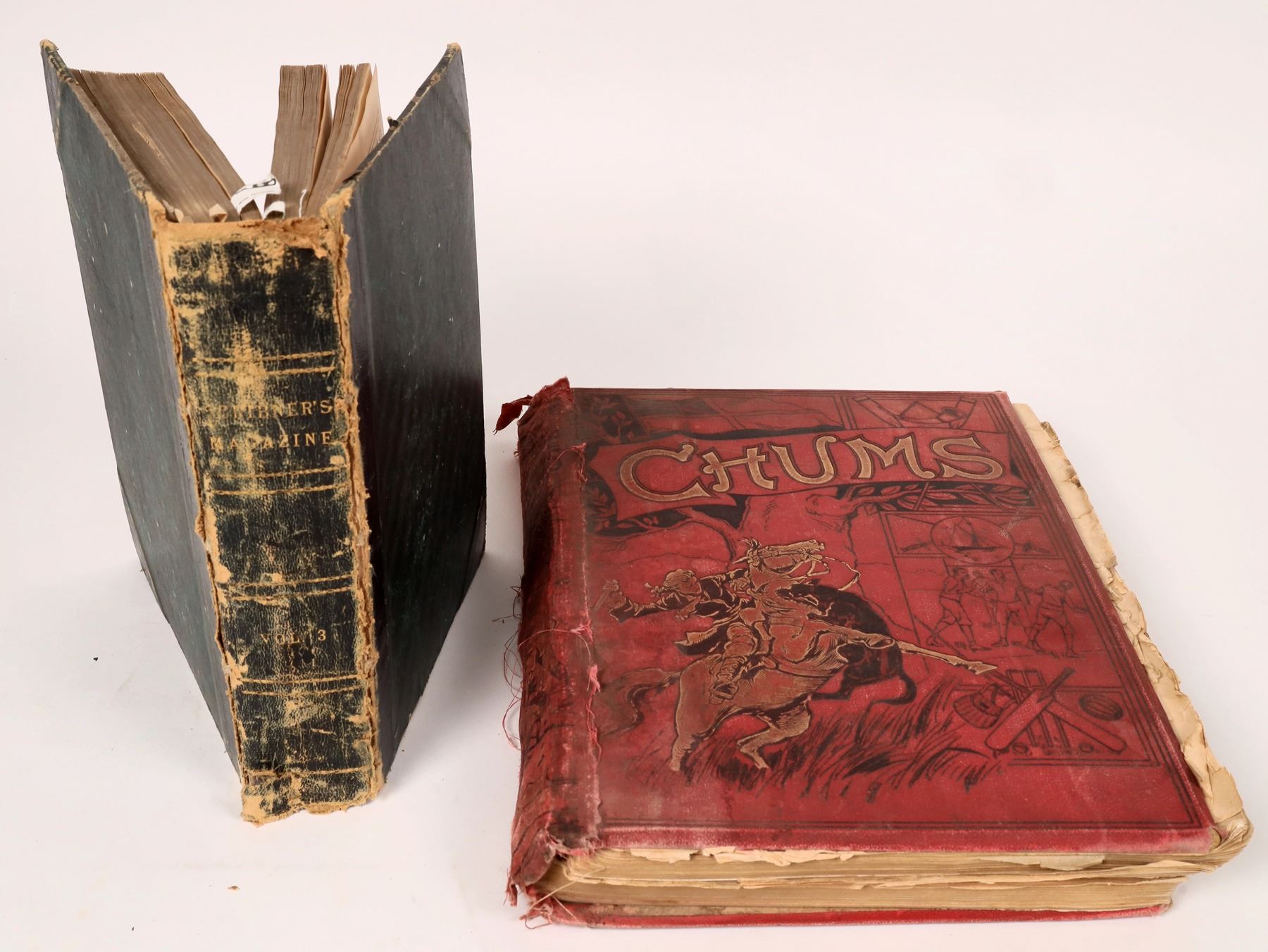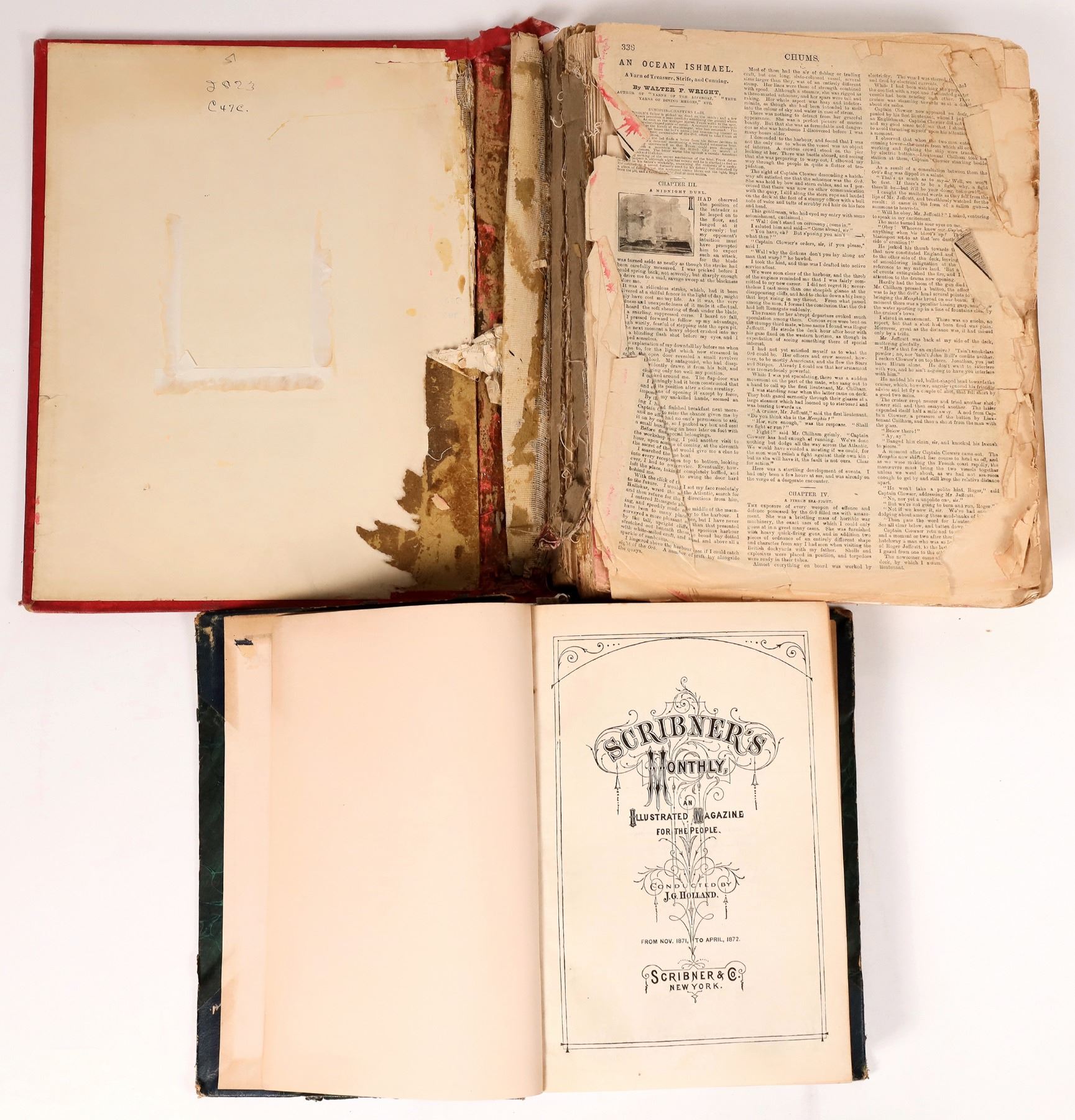 2 bound hardcovers. Scribner's Monthly, Nov. 1871-April 1872, 764pp. Chums 831pp. Both have condition issues, please inspect. Sold as is.