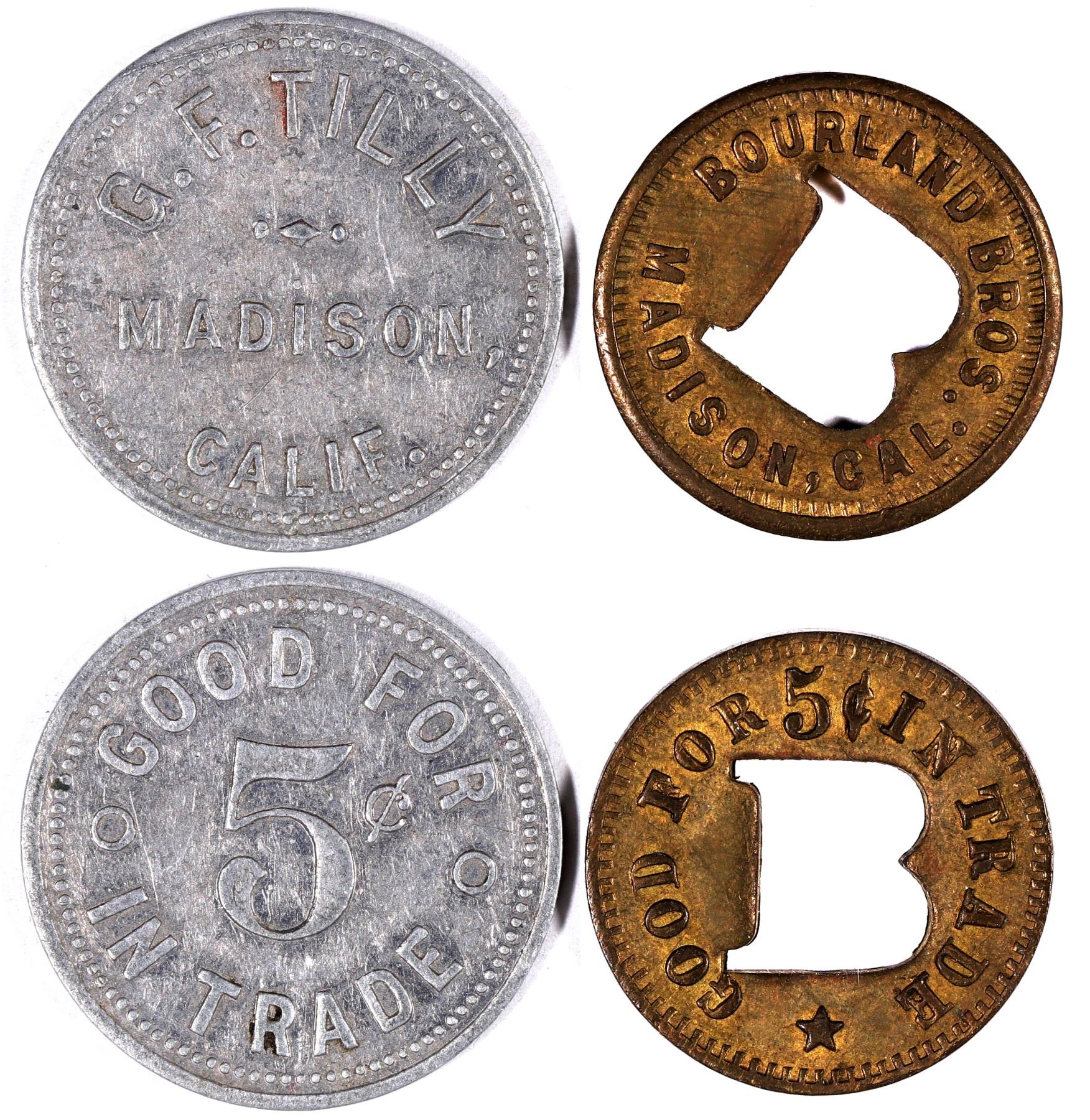 Lot of two tokens from Madison: 1) BOURLAND BROS. / MADISON, CAL. // GOOD FOR 5¢ IN TRADE ("B" cutout); Br., rd., 21 mm. 2) G.F. TILLY / MADISON, / CALIF. // GOOD FOR / 5¢ / IN TRADE; Al., rd, 25 mm. Ex: Ron Lerch collection.