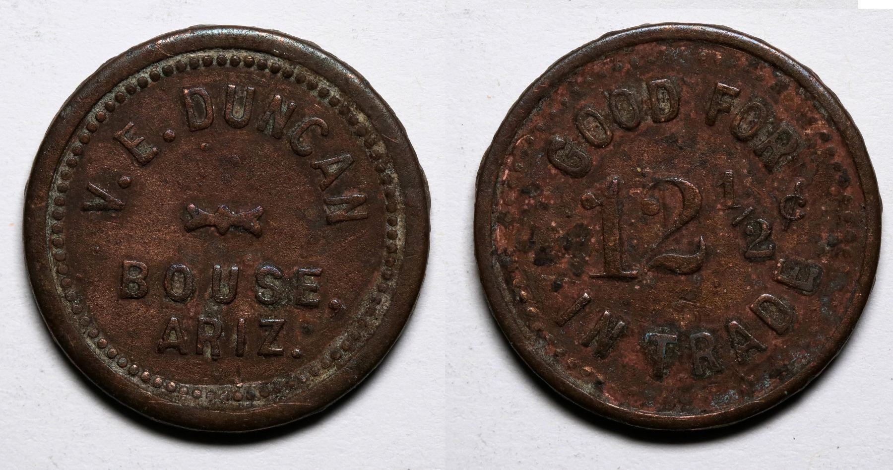 V.E. Duncan/ Bouse/ Ariz// G.F./ 12 1/2c/ In Trade. Rd., Br., 21mm. R-9.