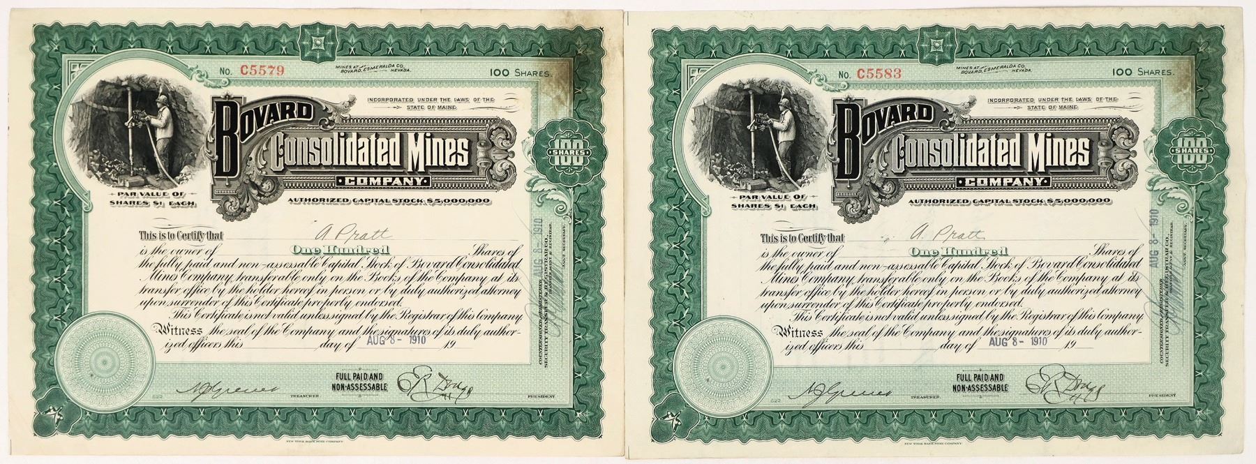 2 Bovard Consolidated Mines Company Stocks 1910. Both issued to A. Pratt. Bovard was a mining district 22 miles NE of Hawthorne. Mines located at Bovard, Esmeralda Co. [Ref: Nevada Place Names]
