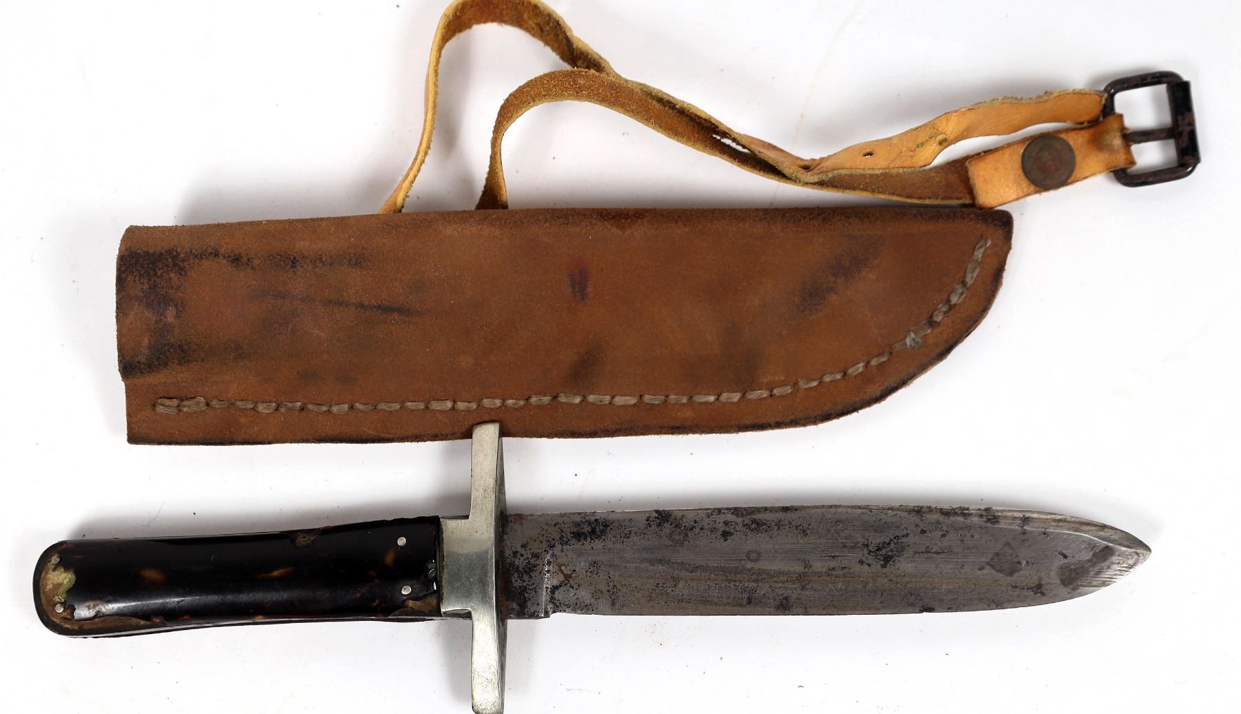 This is a George Wolstenholme Bowie knife made by Washington Works Sheffield, Eng. The knife is 9 in. overall length with a 5 1/2 in. blade, shaped to a dagger point with I*XL at the ricasso. The handles are pinned in four places, solid mounting with an oval in the left side. Shipped scales on right side. A very heavy guard. C. 1870's. Good condition. c. 1870s Jim & Barbara Sherman Private Western Mining Museum