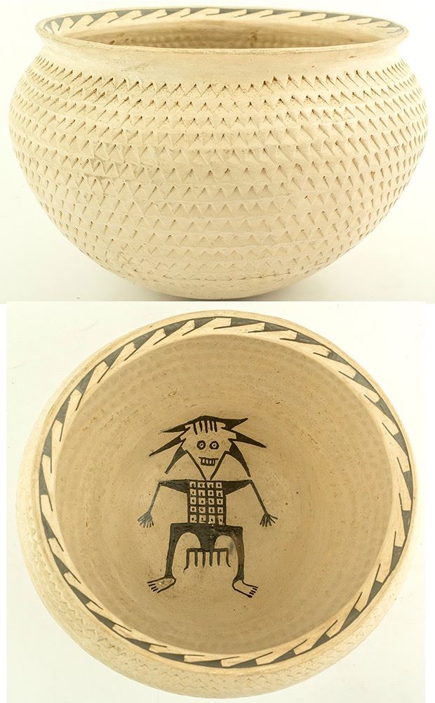 Mata Ortiz Indian Pottery, Casas Grande, New Mexico. Large bowl signed Felix Ortiz, however, not the real Felix Ortiz who was known for starting this pottery movement. Strange looking figure painted on inside of bowl. Date: Location: New Mexico HWAC# 51046