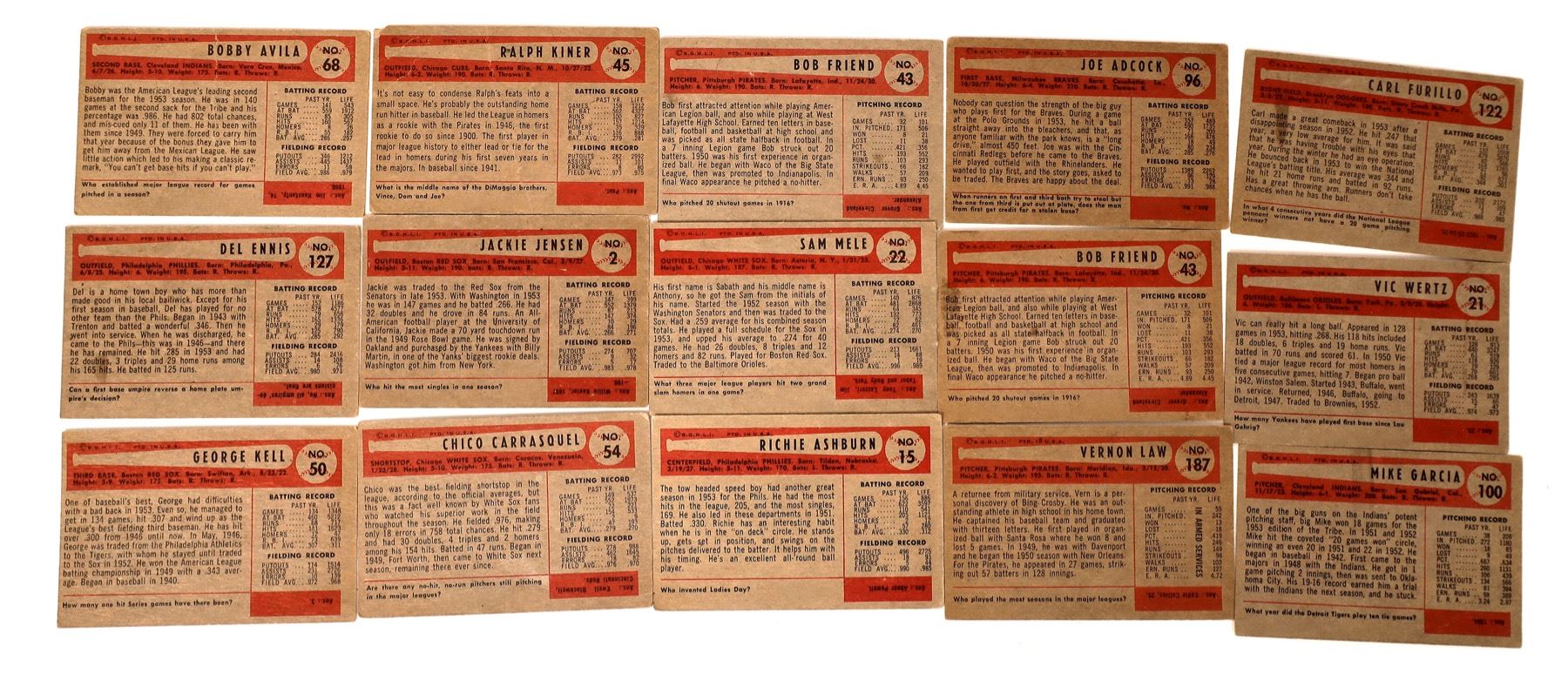 Lot of 15 with some important names. Ralph Kiner (lead the league in home runs 7 consecutive seasons), Richie Ashburn, Vern Law, Bob Friend (2), Carl Furillo, Jack Jensen, Vic Wertz, George Kell, etc. Kiner and Avilla have folds down the middle. Otherwise very nice for 68 year old cards.