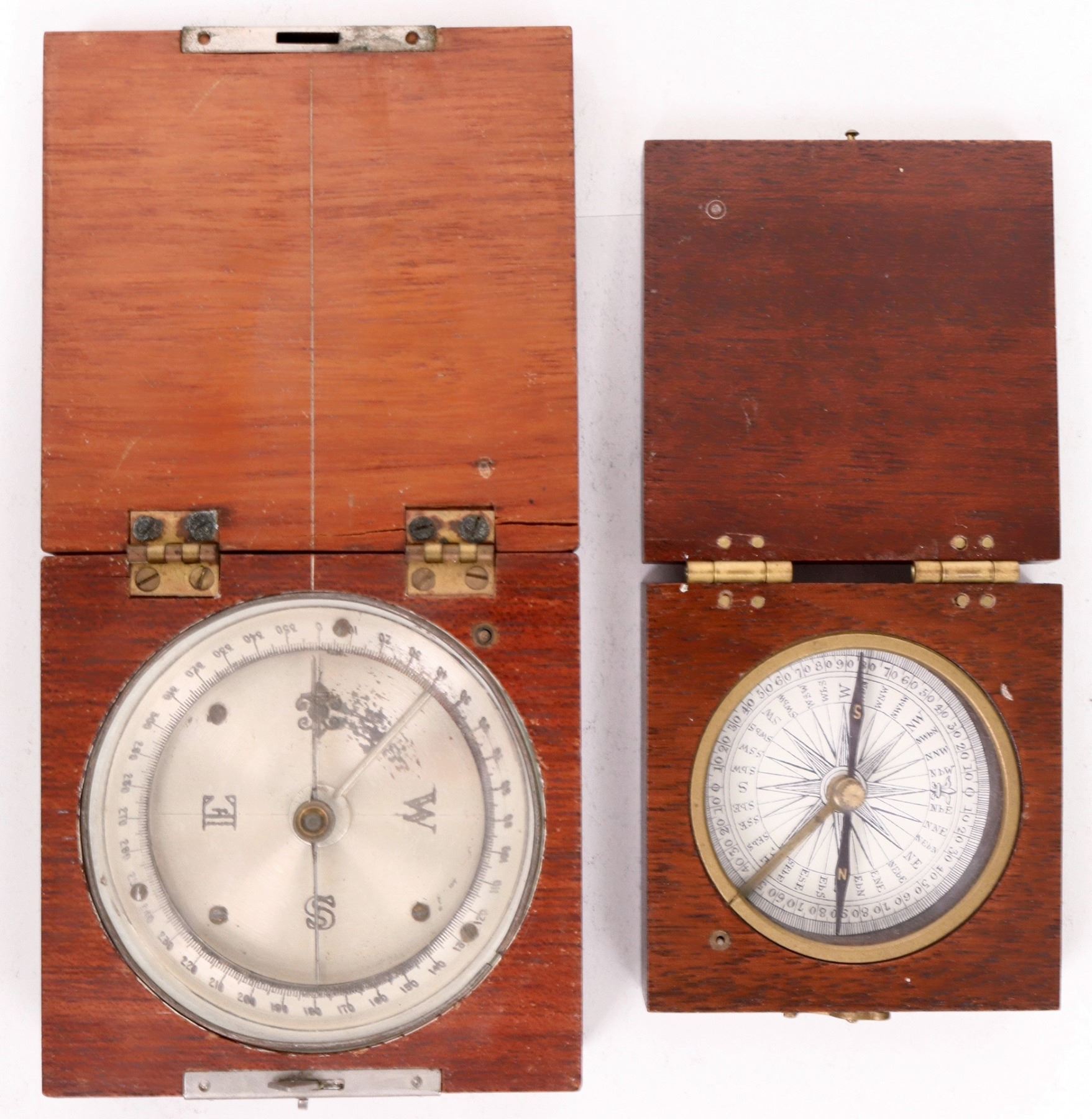 There are two wood box compasses: a David White marked: "U.S. Eng. Dept./ David White Co/ Milwaukee, Wis,/ 1918" on the cover. 3.125 in. X 3.125 in. This was likely used by the Army in WW1. Nickel silver catch, Polished silver cards, North is marked with the fleur de lis. In working order. Slight crack in the wood at one hinge. A second compass is a Thomas Jefferson Memorial Foundation box compass. At 2.5 in. X 2.5 in. Marked on the bottom from Monticello. Please see photos for details.