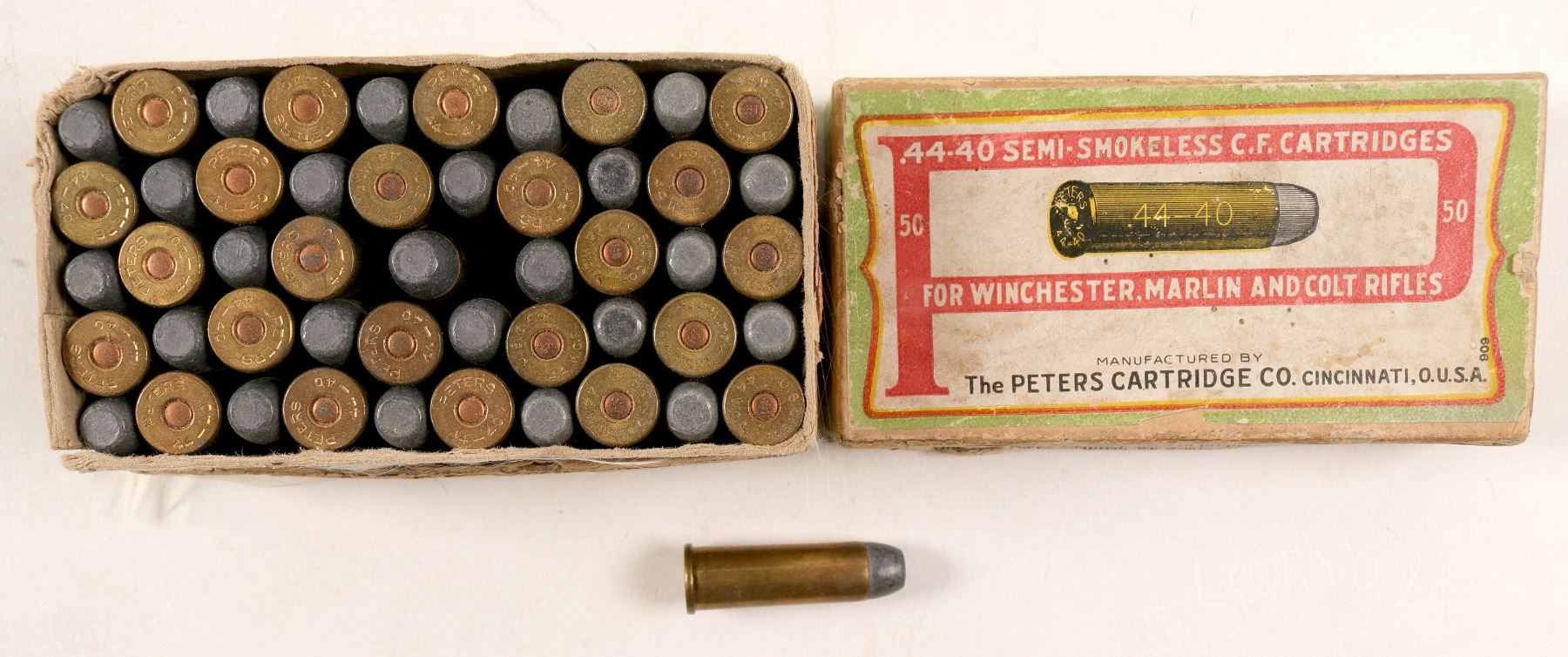 This is a two- piece box of 44-40 cal. Peters semi-smokeless center-fire cartridges. Early rare two-piece box of Peters 44-40 SEMI-SMOKELESS cartridges; this round was made for the famous Colt single action Army in 44-40 cal. and its side-kick Winchester 1873 rifle. These rounds were reported to be of the age of the beginnings of smokeless powder dating between 1883-1893. When smokeless powder was introduced it was too powerful for the firearms of the day. So semi-smokeless was a bridge between a powerful smokeless cartridge and a powder that firearms of the day could handle. A very rare cartridge in of it's self let alone a two- piece box of 50 rounds. No sales to California, Hawaii, New Jersey, Connecticut, and New York City.