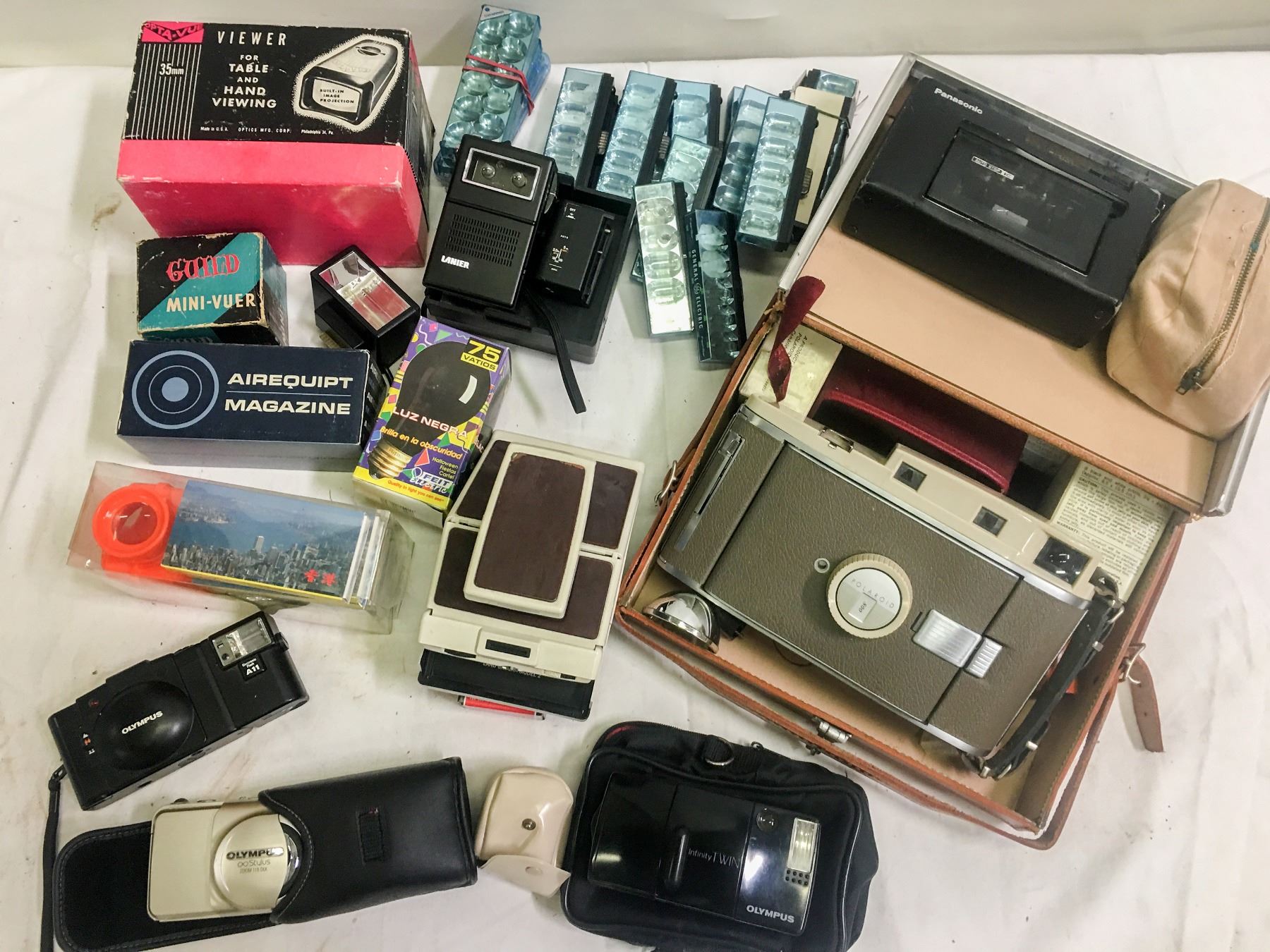 A box full of photography items- Polaroid SX70, flash bars, Polaroid 80 with leather case and more