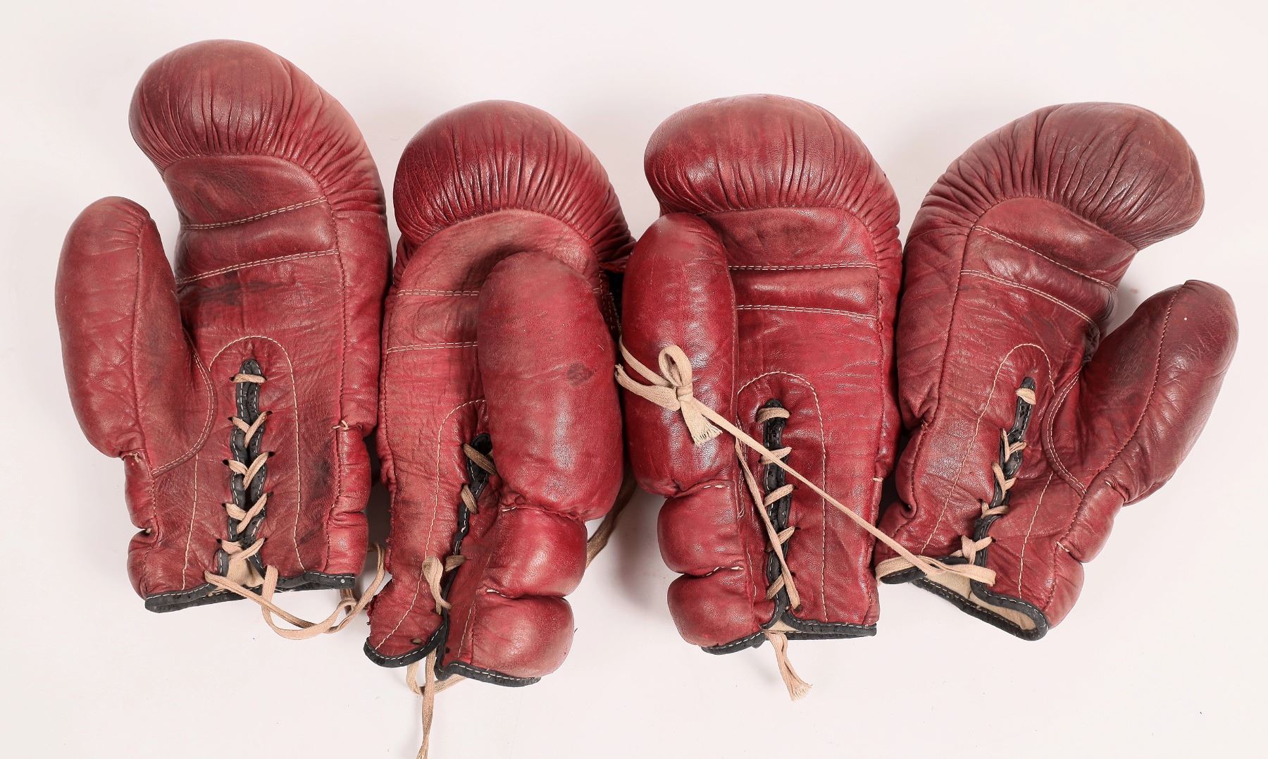 2 pairs of c.1940's magenta colored vintage boxing gloves. No maker or size indicated.