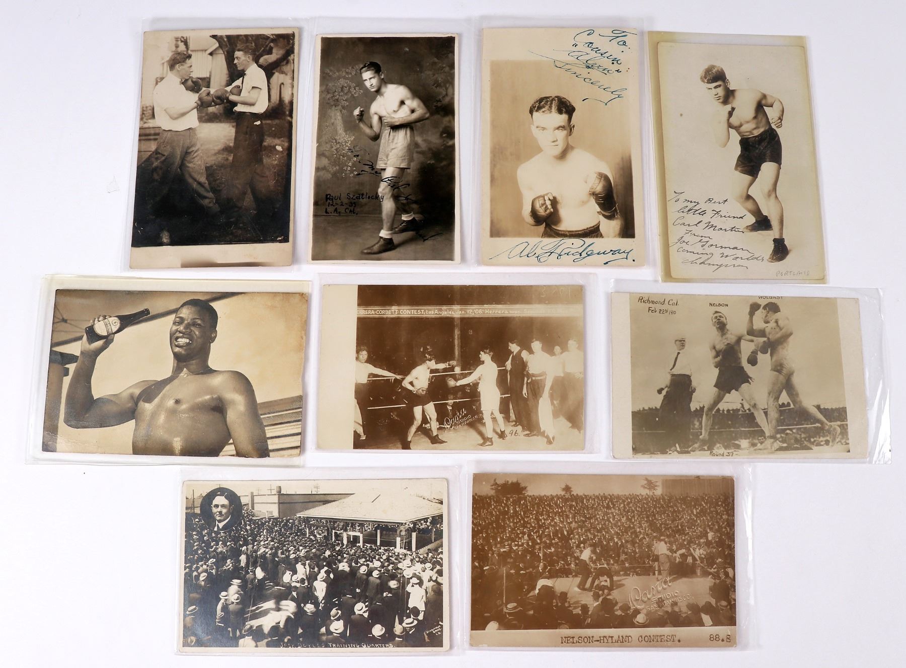 Lot of 9. Views : Nelson-Hyland contest 1909 World Championship shows Hyland down (this would be 23rd round). Nelson-Wolgast 40 rd fight 1910 (Nelson lost as ref stopped the fight). Herrera-Corbett contest 1906(Corbett knocked out in the fifth rd.) Signed card by Joe Gorman (Spanish Tamale, 201 bouts won 88 lost 42 rest draw). Al Ridgeway featherweight signed, Cuban Boxer Nino Valdes-stats on back for him and Marciano. Ken Prag Collection