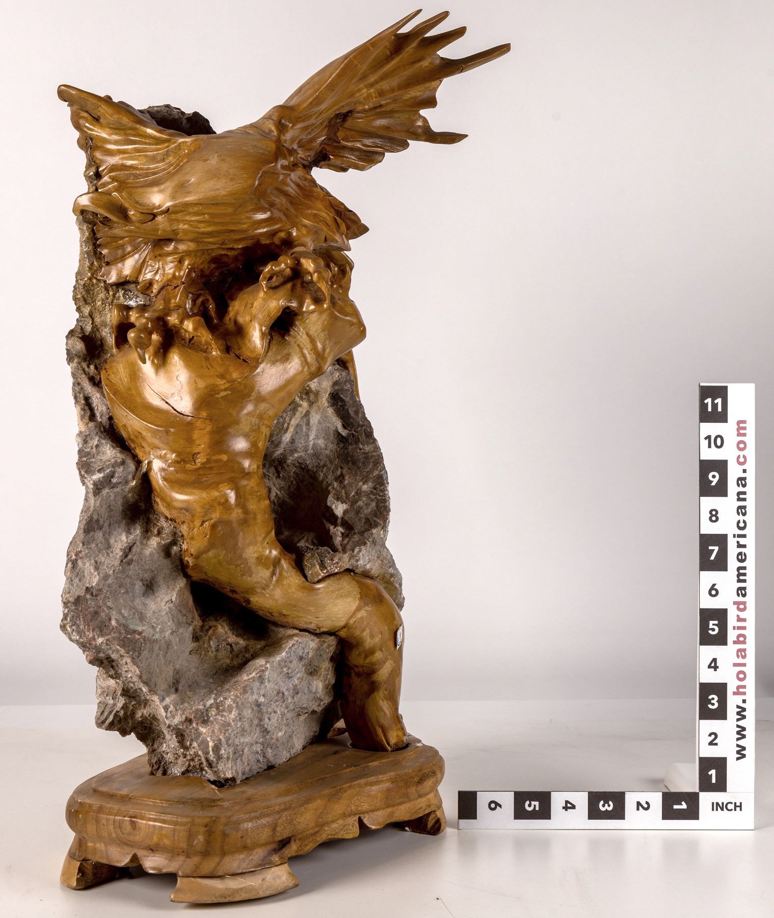Exquisitely sculptured and polished roots of a Chinese boxwood tree which had grown around a calcareous rock that remains entwined in the roots after it was dug up and hand-fashioned. This carved figure is of a bird in flight. Custom-made wood base included. See photos for design details. Fujian Province China