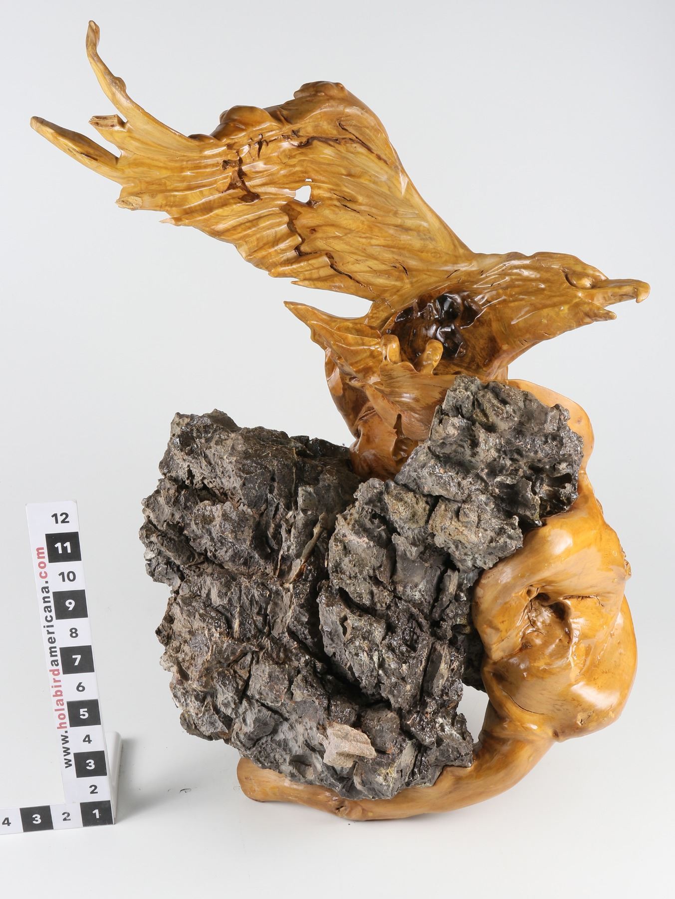 Sculpture made of the polished roots of a Chinese boxwood tree which had grown around a rock. Carved eagle or falcon. 17x15x26 Fujian Province China Chunlin Zhu Collection