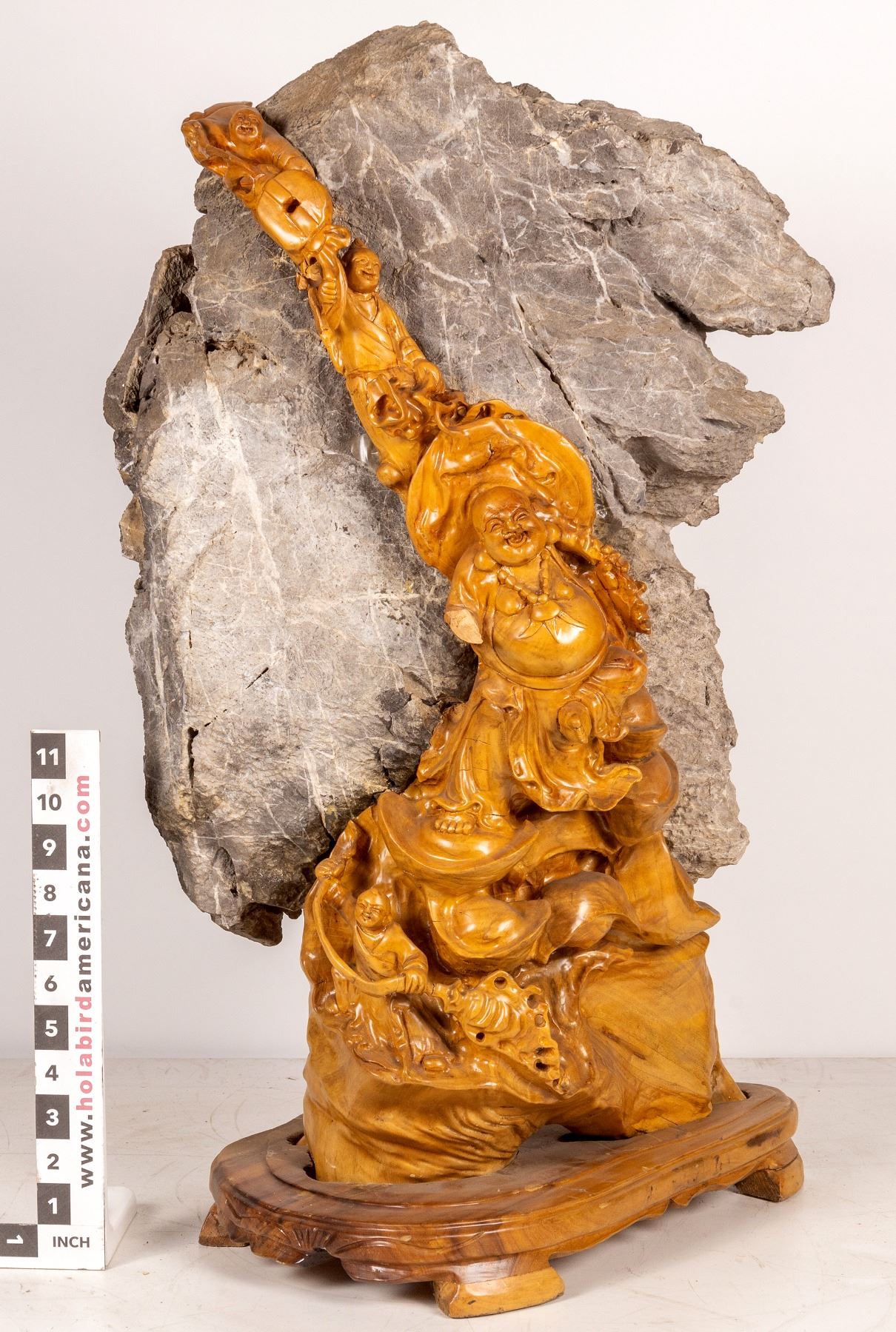 Sculpture made of the polished roots of a boxwood tree which had grown around a rock. A happy buddha figure rests against a rock with two, smaller figures above and below him. See photos for design details. Fujian Province China