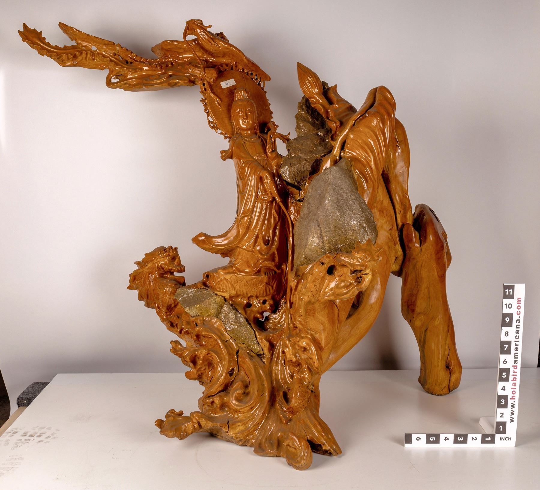 Sculpture made of the polished roots of a boxwood tree which had grown around a rock. This carved figure is of an Asian deity pouring water from a bottle to a fish near the base. See photos for design details. Fujian Province China