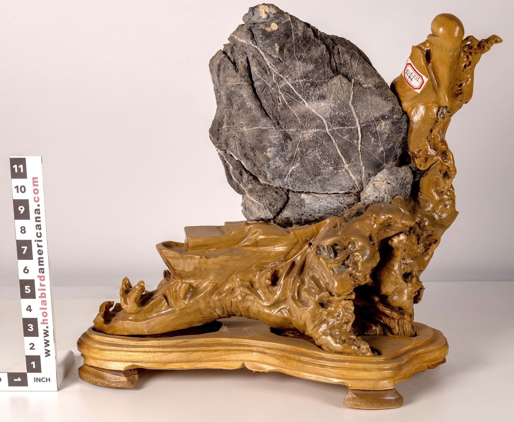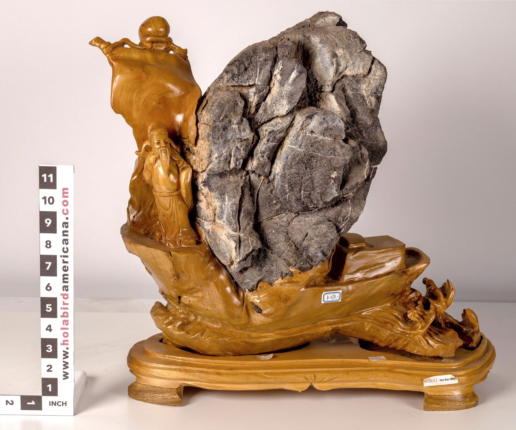Sculpture made of the polished roots of a Chinese boxwood tree which had grown around a calcareous rock. This carved figure is of a quintessential Chinese sage standing beside the entrapped rock. Custom-made wood base included. See photos for design details. Fujian Province China