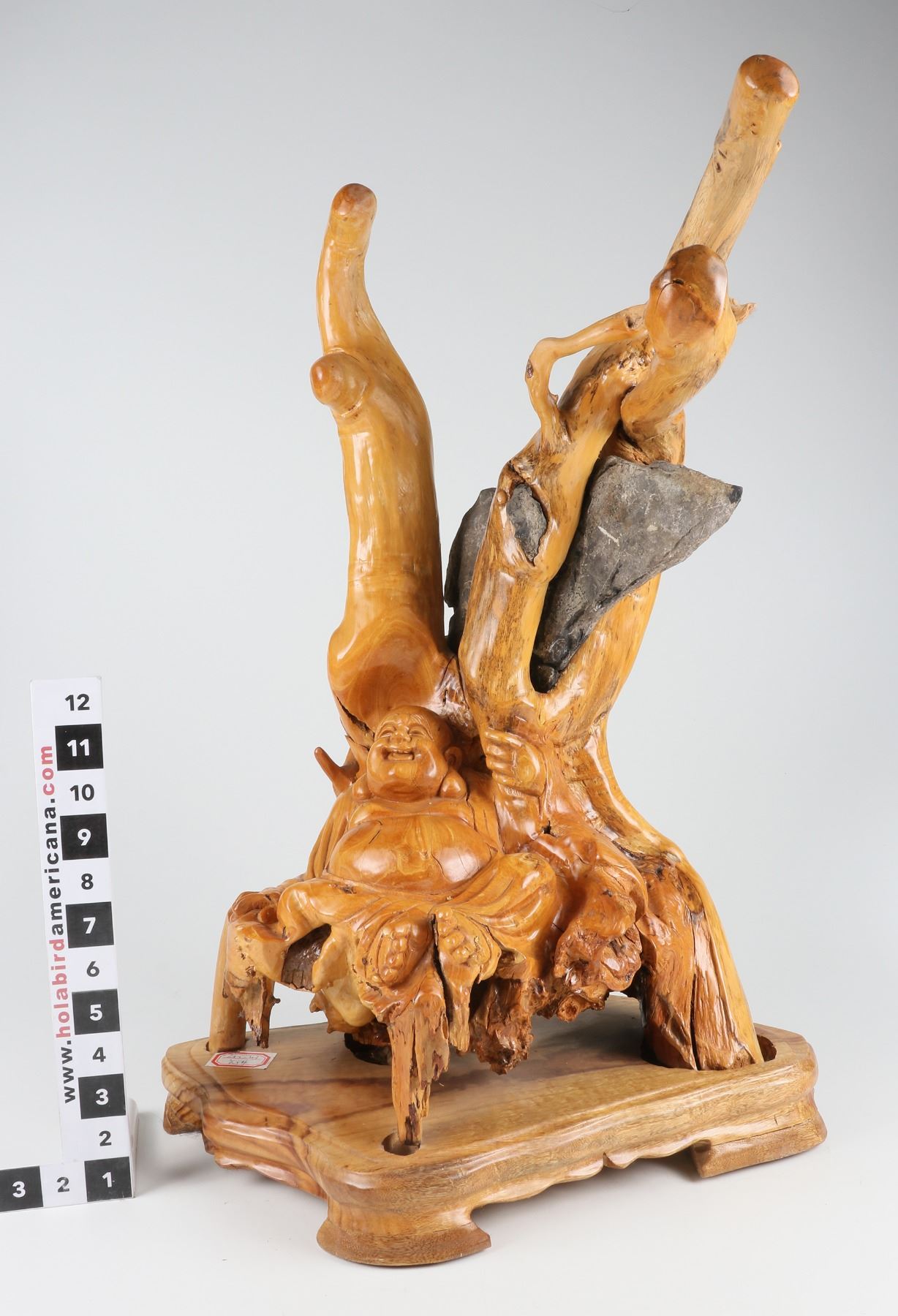 Sculptured and polished roots of a Chinese boxwood tree which had grown around a calcareous rock . This carved figure is of a seated Budda. Custom-made wood base included.