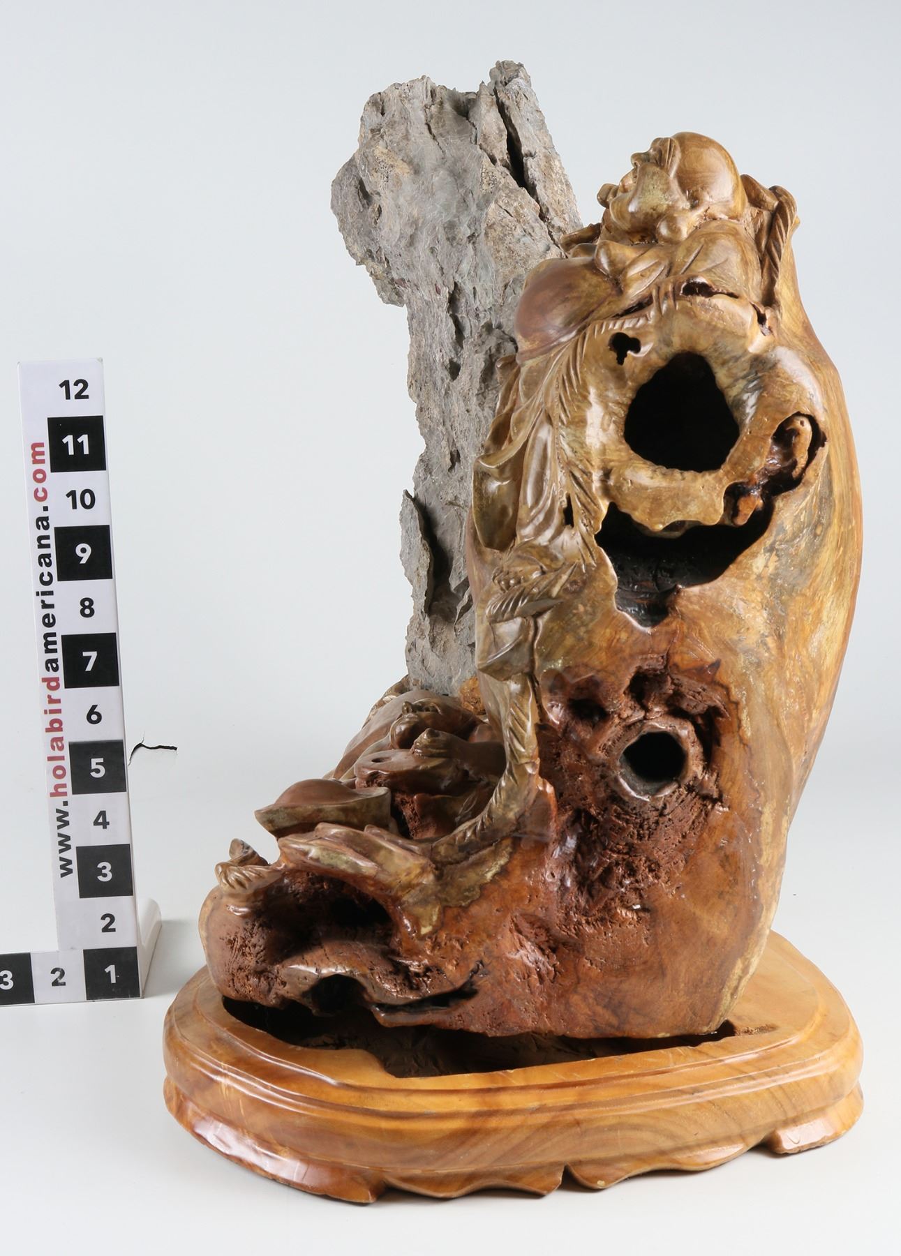Sculpture made of the polished roots of a boxwood tree which had grown around a rock. Carved .Buddha and a figure bowing, on a base. 17x24x12"
