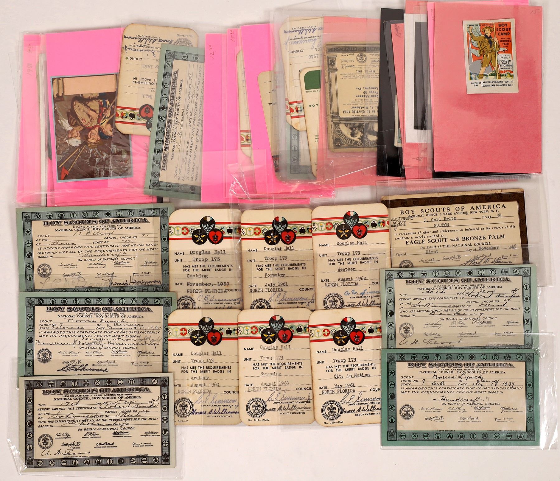 About 60 pieces of ephemera connected to the Boy Scouts of America. Pice's include merit badge certificates, membership cards, "Life Scout" cards, commemorative stamps and more. All are in good shape. Please see photos for more detail and content.