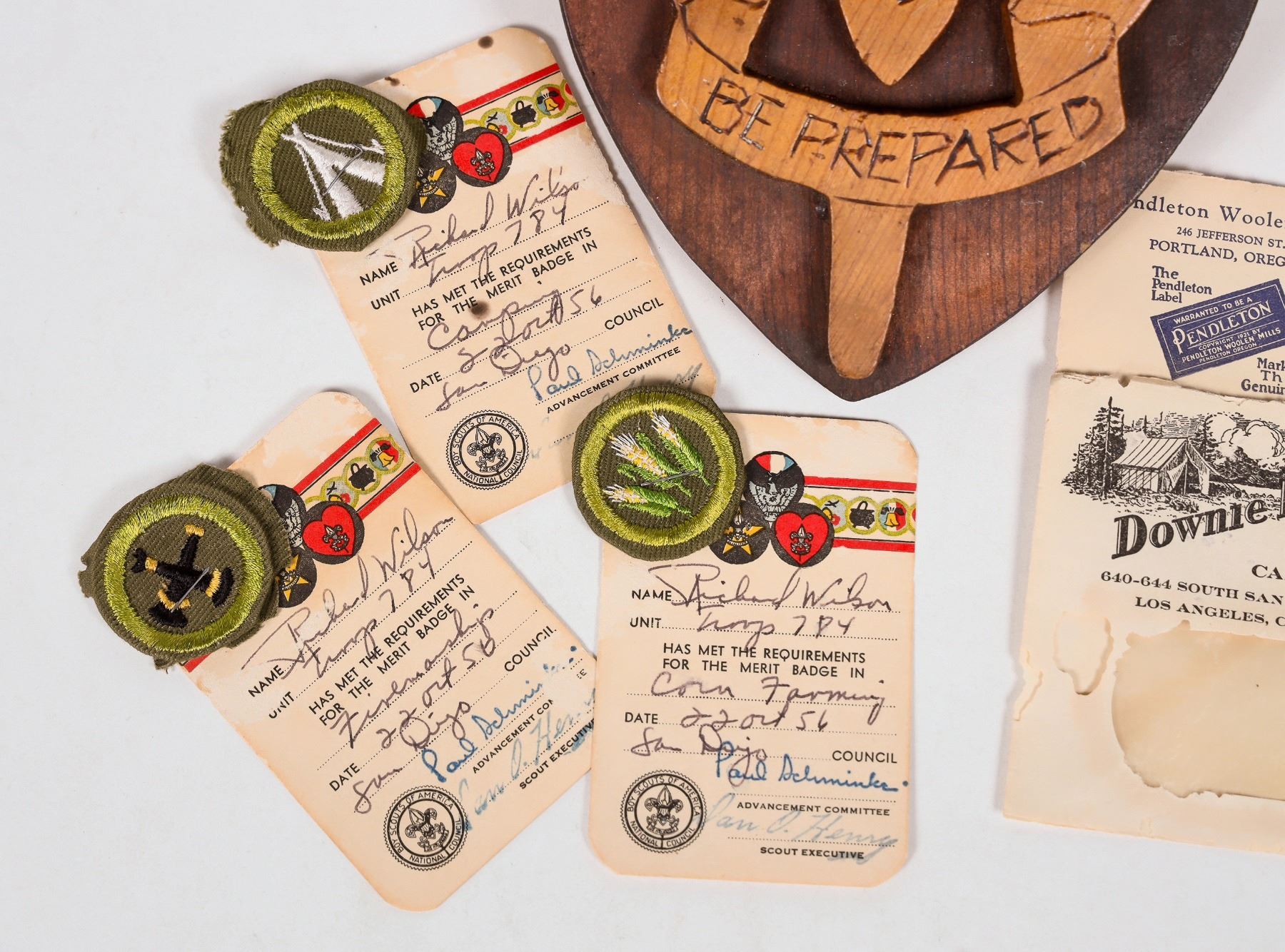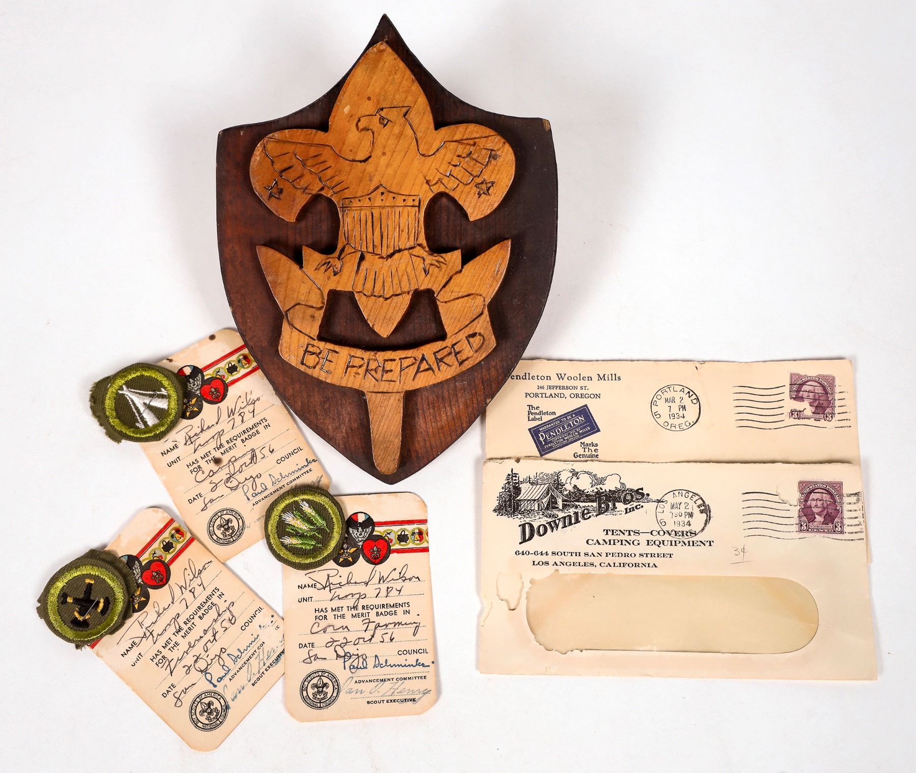 Lot of 6. 1. Two postal covers dated 1934 w/3 cent stamp. Pendleton Wool Co. and Downie Bros camping supplies L.A. 2. Three Boy Scout merit badges w/orig. cert. card 1956 3. Handmade plaque of Boy Scout eagle/shield "Be Prepared" carved below eagle.