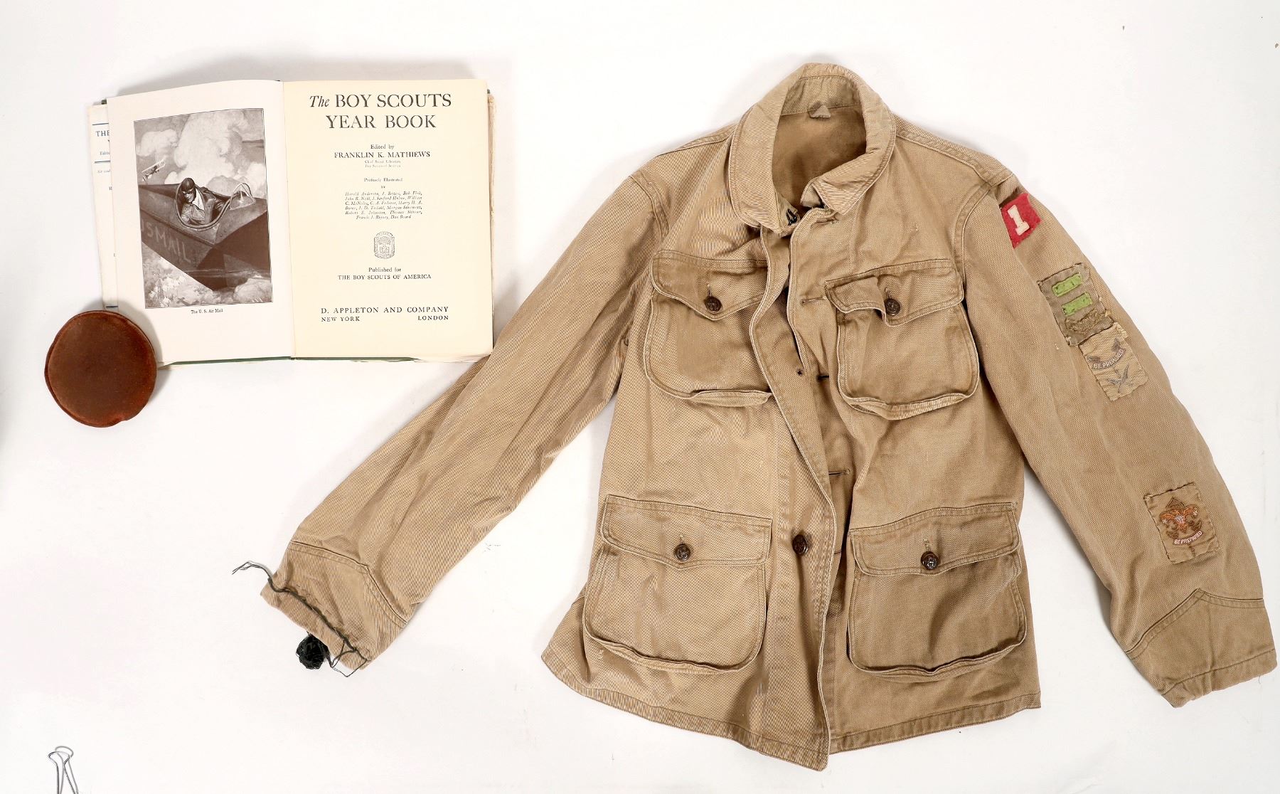 c. 1910's-1920's Boy Scouts khaki shirt and 1928 Boy Scouts Year Book-dust jacket has wear. Please inspect.