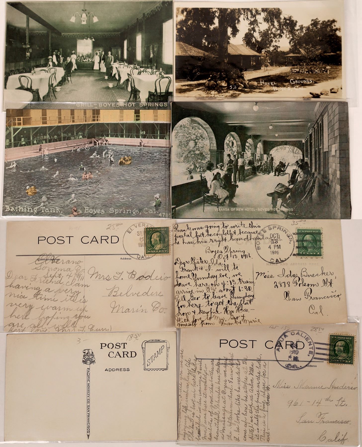 Henry E. Boyes discovered hot springs in central Sonoma Valley in 1895, and with his wife named the spot Agua Rica. They started Boyes Hot Springs which became an attraction for tens of thousands of people who visited the area. The hotel closed during the Great Depression, and the site became a training center for Bay-area sports teams. The US Navy sent sailors to the area for recreation during WWII. The original Boyes Hot Springs is now the site of the Fairmont Sonoma Mission Inn and Spa. The street beside it is named Boyes Blvd. today. This lot contains four images of Boyes Hot Springs from it's glory days.