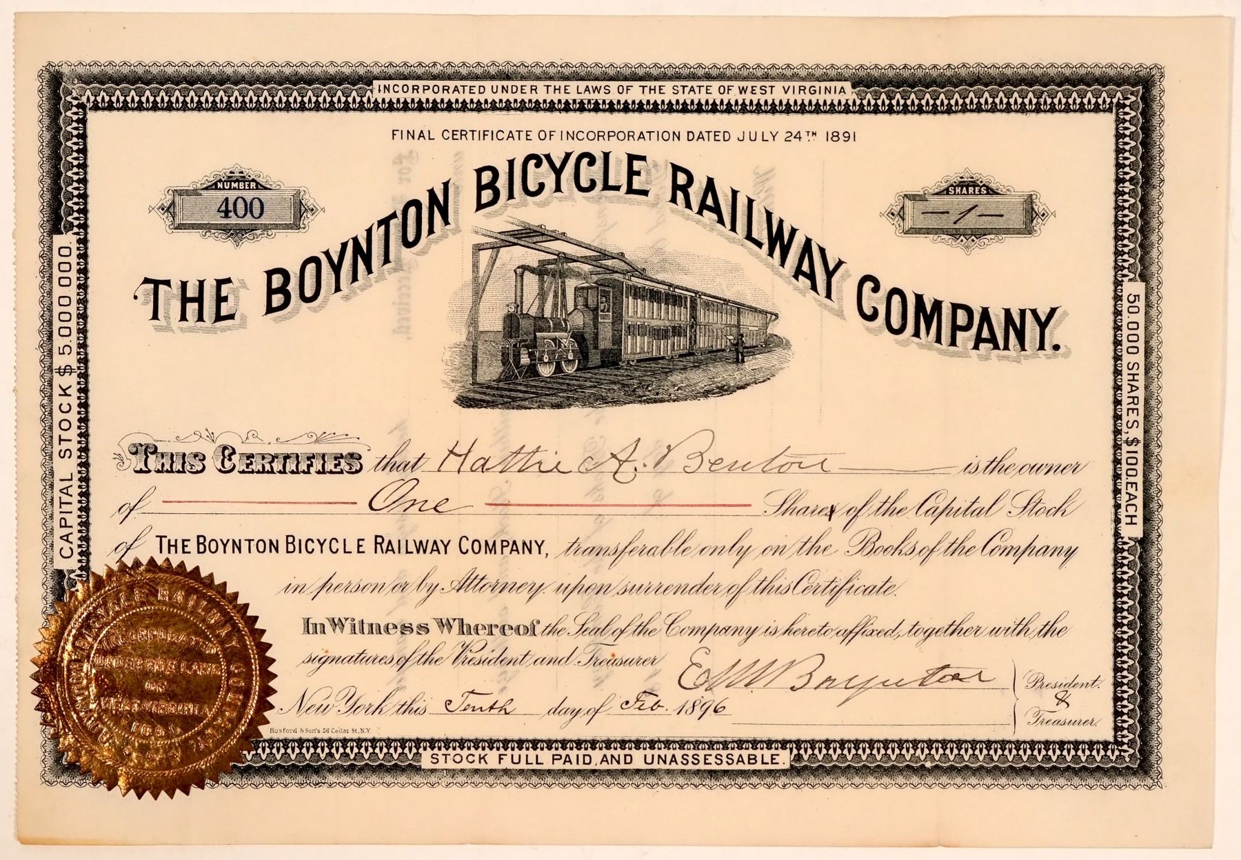 Cert. #400, issued for 1 share in 1896 and signed by E.M. Boynton as president. Bicycle train runs right to left. Shares were $100 Each. $5,000,000 Total capital. Hosford & Son, N.Y. printer. Uncancelled. Very nice with a unique vignette. The company incorporated in 1891. Black, odd shares. The railroad was a monorail in Brooklyn, N.Y. It ran on a single load-bearing rail at ground level, but with a wooden overhead stabilising rail engaged by a pair of horizontally opposed wheels (wikipedia).