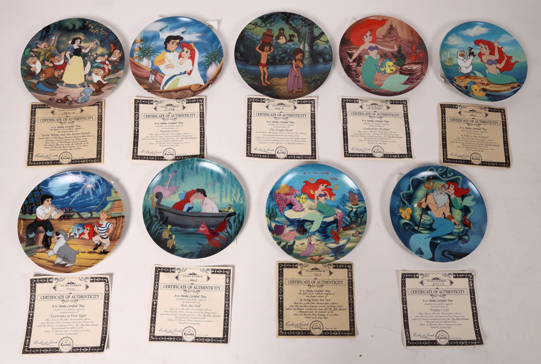 9 Bradford Exchange 8" plates with COA's. The Jungle Book, Snow White and the 7 Dwarfs. The Little Mermaid-Song From the Sea, Kiss the Girl, Visit to the Surface, Forever Love, Fireworks at First Sight, Daddy's Girl, Underwater Buddies. City: State: Date: