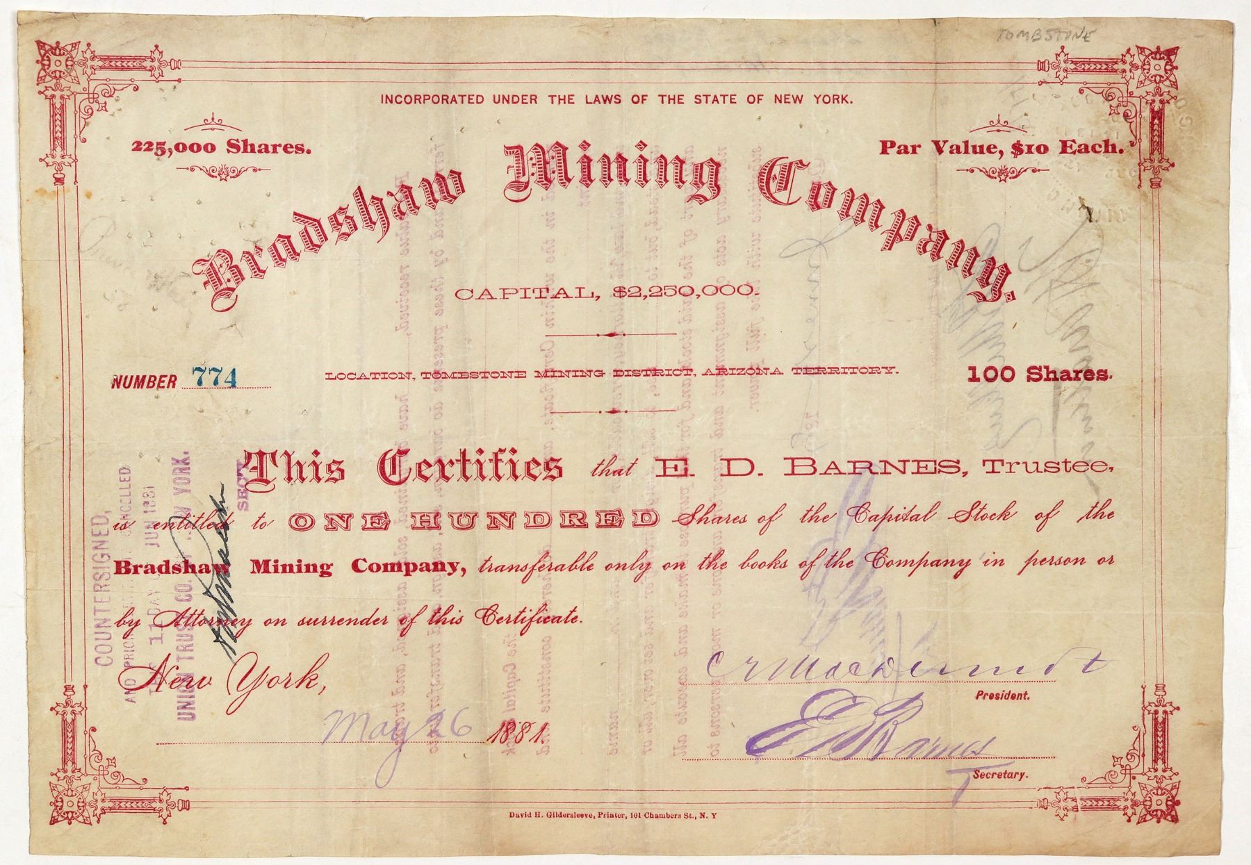 Rare. Location: Tombstone Mining District, Arizona Territory (printed under title). Inc. in New York. No. 774, issued for 100 shares to E.D. Barnes, trustee, on May 26th, 1881. Signed by Barnes as secretary and the president (Dermott?). Not cancelled. Red border and print, no vignette. Pinholes, folds ,creases, soiling. 7.25 x10.75" According to Burchard in 1882, “The Bradshaw mine was a valuable mine of the Tombstone District. It is located in the western part of the district near the San Pedro and opened by a shaft to a depth of about 400 feet. It’s vein was 2 o 6 feet in width. The ore is rich in chloride and carries horn silver, from which assays ranging from $80 to $100 per ton have been had. A ten stamp mill has been erected on the property. It has produced some $50,000 of bullion since first opened.” Ken Prag Collection