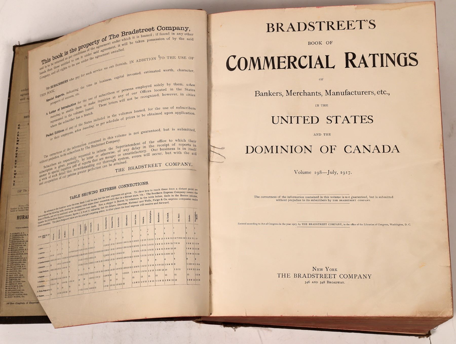 This book of commercial ratings was created by The Bradstreet Company in 1917. The book details ratings on bankers, merchants, manufacturers, etc. in the United States and the Dominion of Canada. 1917, volume 198, good condition. Black cloth cover with red binding. 14.5 x 12 inches.