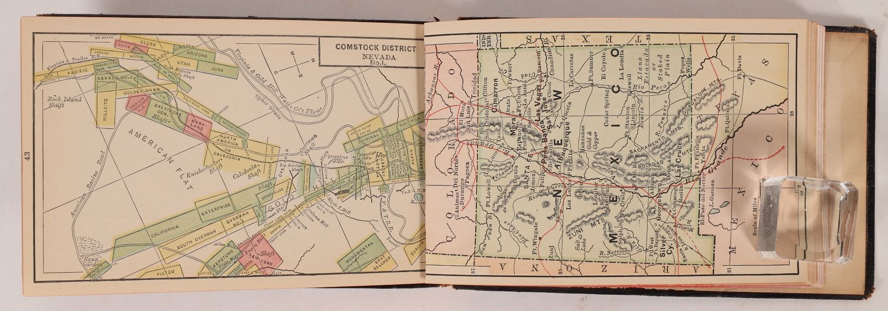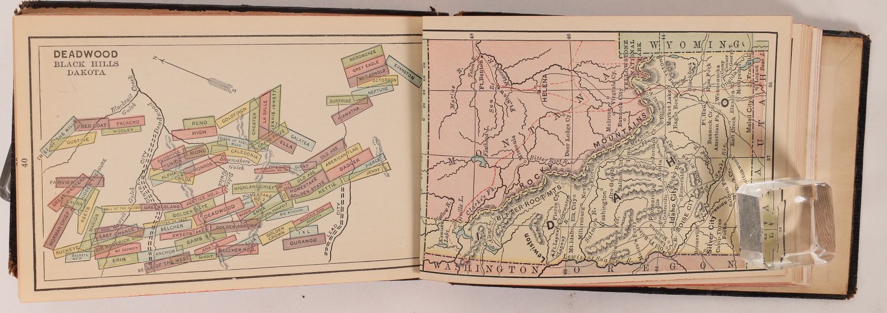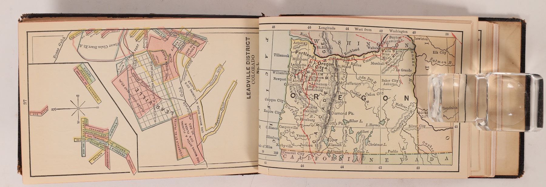 Over the years, we've seen hundreds of different "atlases". This one takes the cake for its combination of mining and geography. Published by Bradstreet, a well known commercial ratings service and publisher (professional researchers use the Bradstreet publications as business directories). Here, Bradstreet changed its presentation and format drastically, for the first and only time that we know of. They published a map atlas, and on pages opposite some of the western states, published mining district maps and related mining sections. We've never seen this before. Of particular interest are the Bodie and Leadville maps (with multiple Leadville views) and the Comstock which both were at their early production heights. It is thus easy to understand why Bradstreet published these - any businessman from anywhere, USA who was interested in one of these huge and profitable mining districts could look at more detail of the district, while looking at accompanying state geographic maps to try to figure out how to get there. Only four reported by institutional holdings. A true mega-Rarity. 1882 Bradstreet's Pocket US Atlas. Published for Macullar, Parker & Co, Boston. Color maps. 5.25x3.25".
