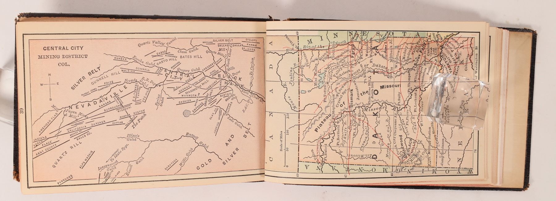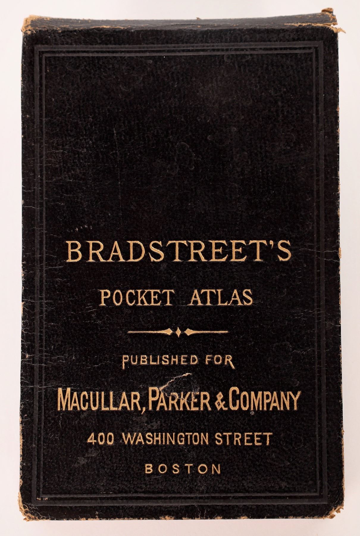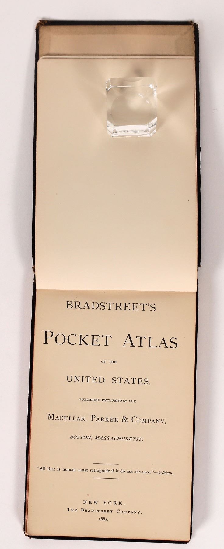 Over the years, we've seen hundreds of different "atlases". This one takes the cake for its combination of mining and geography. Published by Bradstreet, a well known commercial ratings service and publisher (professional researchers use the Bradstreet publications as business directories). Here, Bradstreet changed its presentation and format drastically, for the first and only time that we know of. They published a map atlas, and on pages opposite some of the western states, published mining district maps and related mining sections. We've never seen this before. Of particular interest are the Bodie and Leadville maps (with multiple Leadville views) and the Comstock which both were at their early production heights. It is thus easy to understand why Bradstreet published these - any businessman from anywhere, USA who was interested in one of these huge and profitable mining districts could look at more detail of the district, while looking at accompanying state geographic maps to try to figure out how to get there. Only four reported by institutional holdings. A true mega-Rarity. 1882 Bradstreet's Pocket US Atlas. Published for Macullar, Parker & Co, Boston. Color maps. 5.25x3.25".