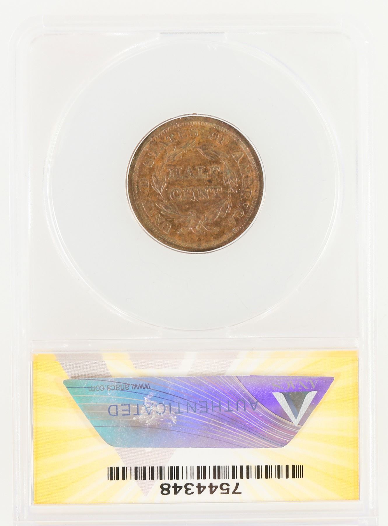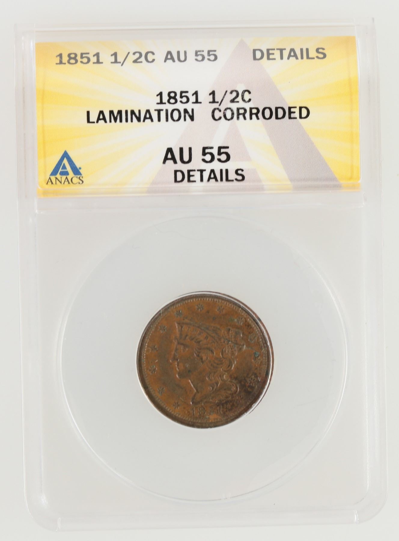 ANACS certified AU 55 Details: lamination, corroded. 1851 Braided Hair half cent.