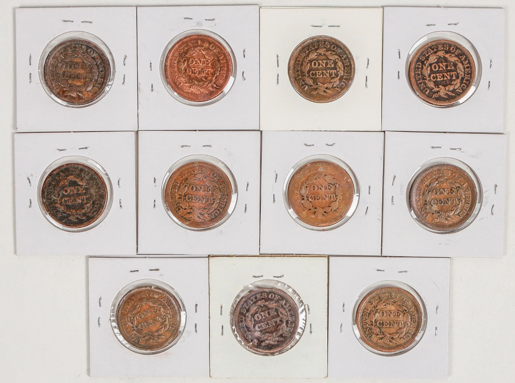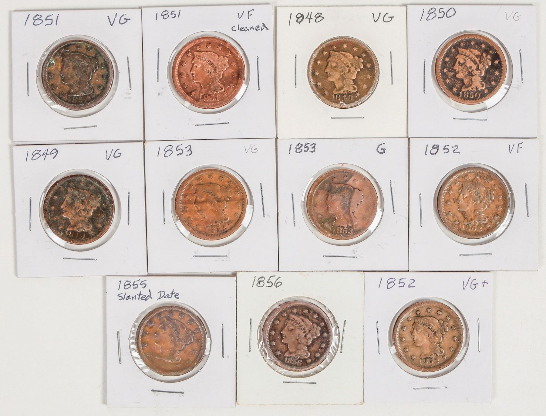 Eleven Braided Hair large cents: 1848 (VG); 1849 (VG); 1850 (VG); 1851 VF, cleaned); 1851 (VG); 1852 (VG); 1852 (VF); 1853 (G); 1853 (VG); 1855 (G-VG); 1856 (G-VG).