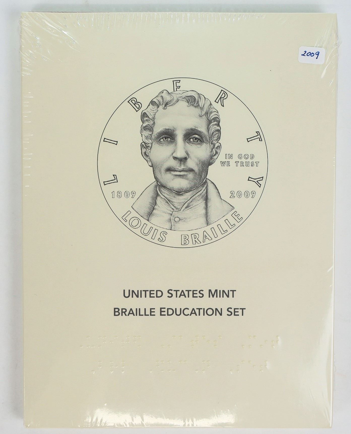 In original U.S. mint sealed package, the Louis Braille Bicentennial Uncirculated Silver Dollar.