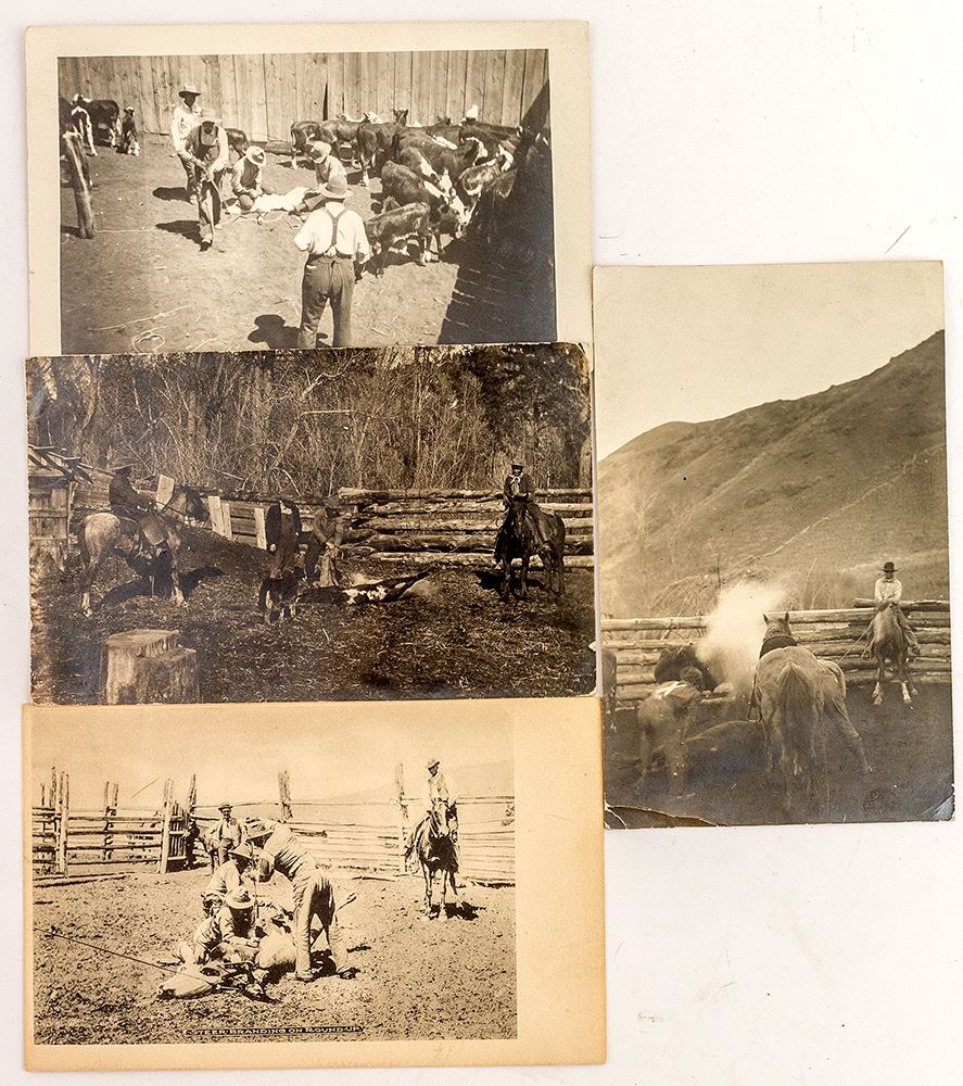 Lot of four real photo postcards of cowboys branding. 1) "Steer Branding on Roundup" unused, made prior to 1907. 2) Branding in a pole corral, postmarked 1909 in Oregon. 3) Colorado cowboys branding in log corral, postmarked 1911. 4) Cowboys branding cattle, unused, but has "Garnd Junction, Colo." Wrote on back, made between 1904 & 1918. State: City: Date: ID# 48949