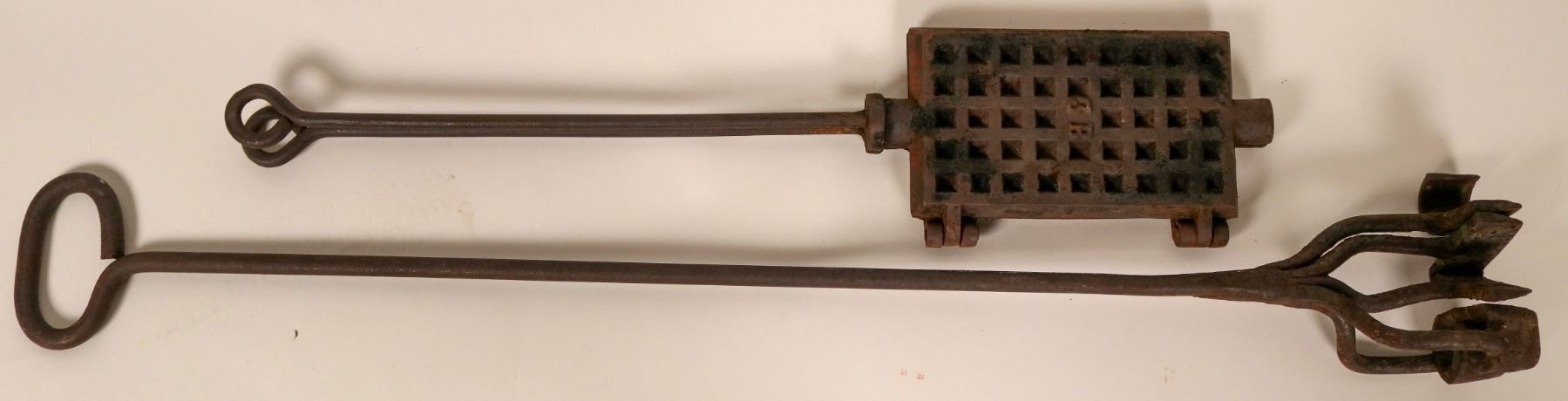 Branding iron & Waffle iron handy tools for the cattle drive. Waffle iron measures 24", while the branding iron JVB, measures 36".Both are in good comdition and ready for use or display.