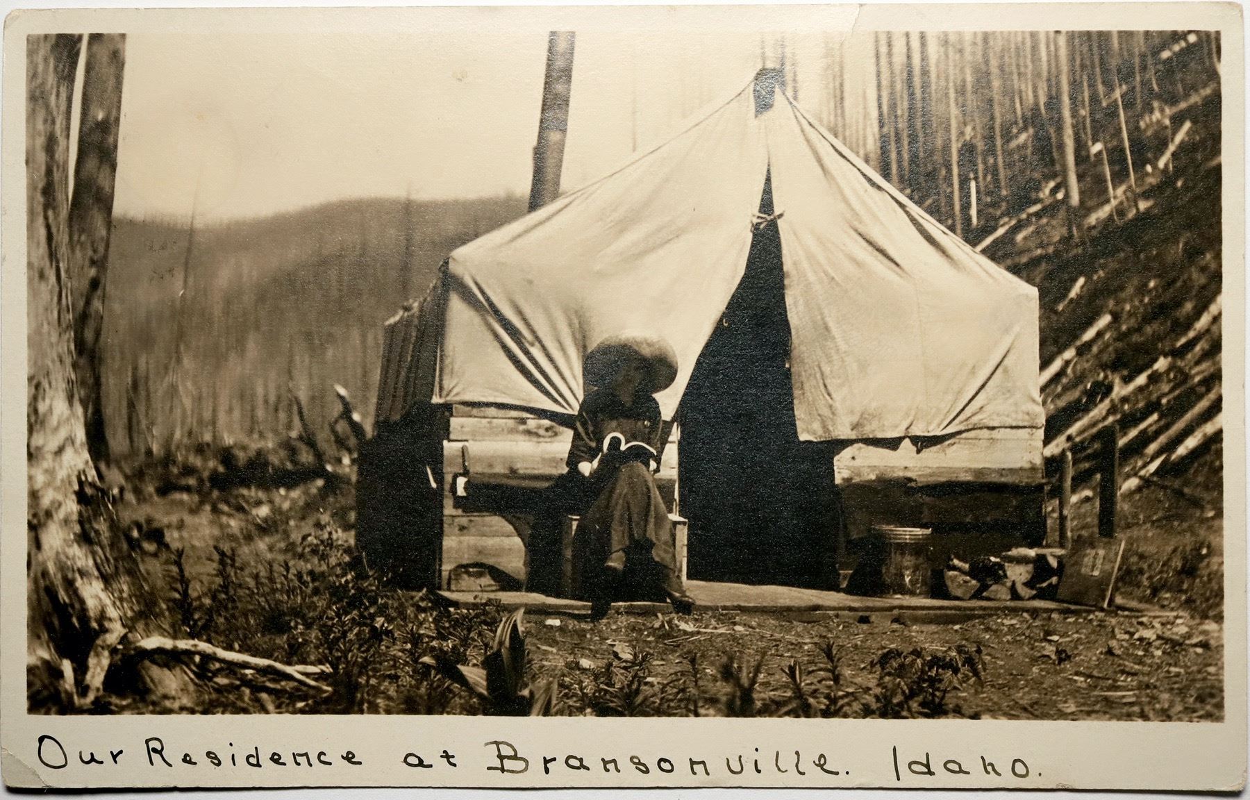 "Our Residence at Bransonville ,Idaho", note inscribed on bottom front of image of a pioneer woman wearing a big straw hat, sitting with a book, in front of a small log cabin, with a tent for the roof top, in what appears to be a logging camp. The trees, are in the background and have no tops; correspondence on rear addressed to Ontario Canada but no cancellation visible, on the 1 cent green stamp;/rare photo, probably early 1900s from the history of logging camps in eastern Idaho.