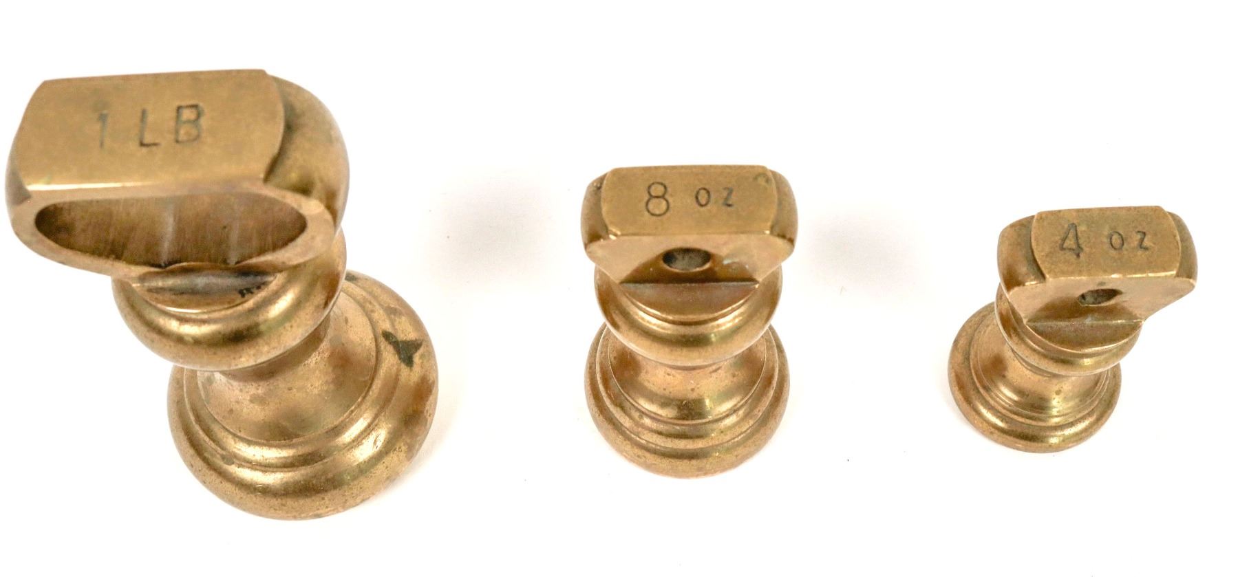 Lot of (3) brass Balance Scale Weights, three specific weights. Machined round brass weights with hanger holes. 4 oz. 8 oz. and 1 LB stamped on tops. Specific tooled holes in each base as well. The 1 LB weight measures 3.5" tall x 1.75" in diameter. Excellent condition for all three.