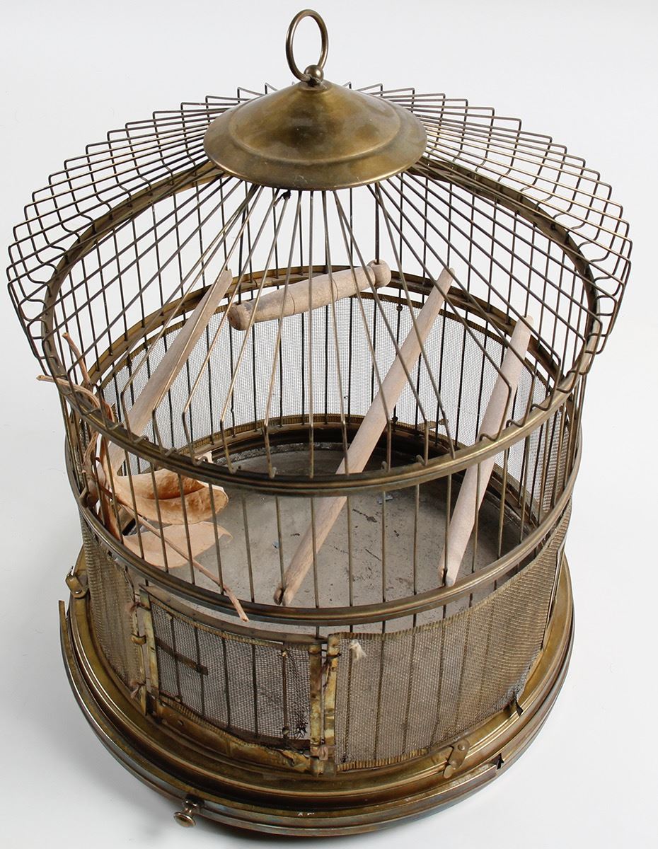 Decorative brass birdcage. 12" diameter 15" high. Very nice stand included--68.5" high. An attractive office or home addition. Date: Location: HWAC# 64451