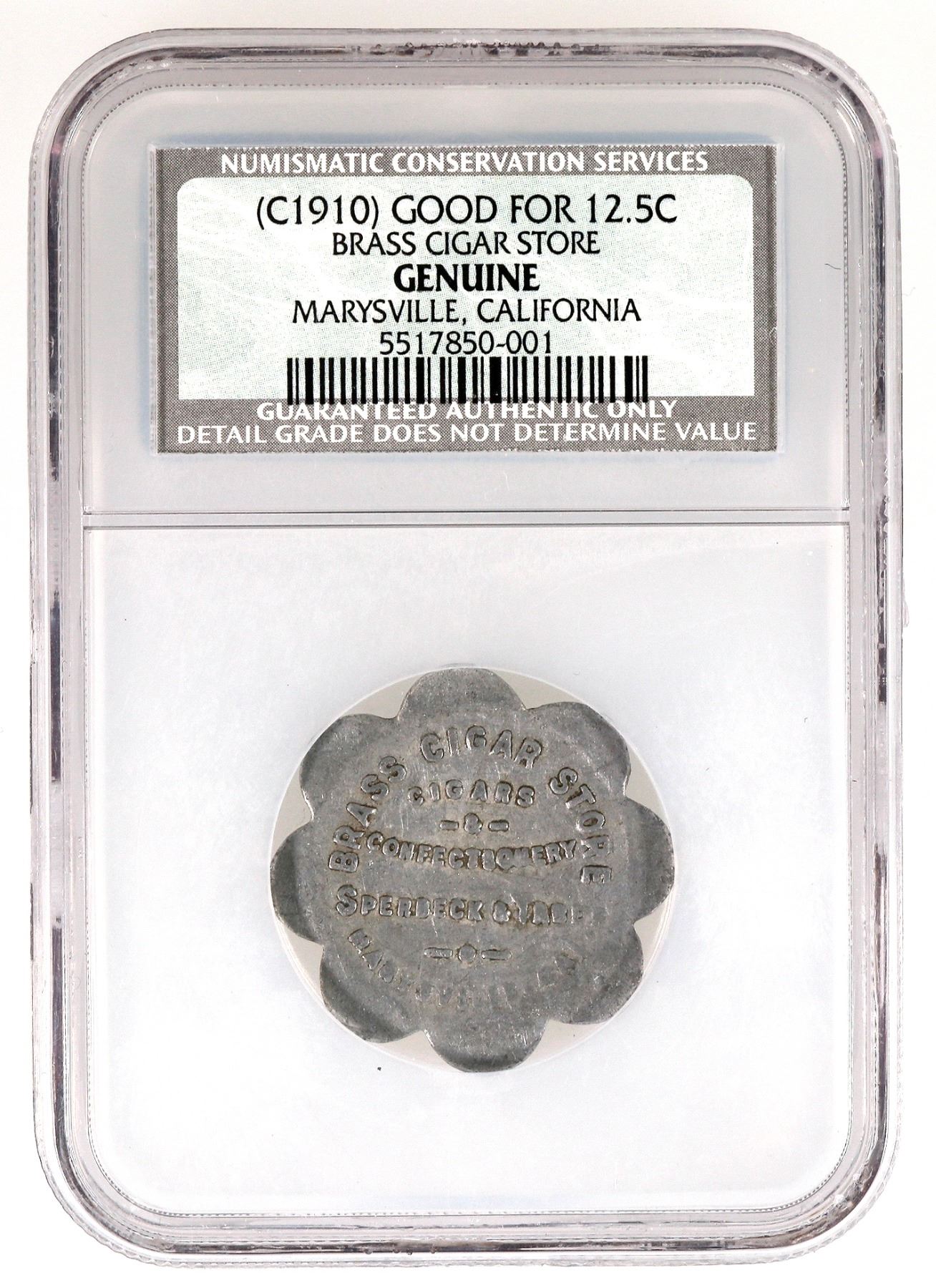 NCS certified Genuine: BRASS CIGAR STORE / CIGARS / & / CONFECTIONERY / SPERBECK & TABER / MARYSVILLE, CAL. // GOOD FOR / 12Ω¢ / IN TRADE; Al., Sc 8, 28 mm.