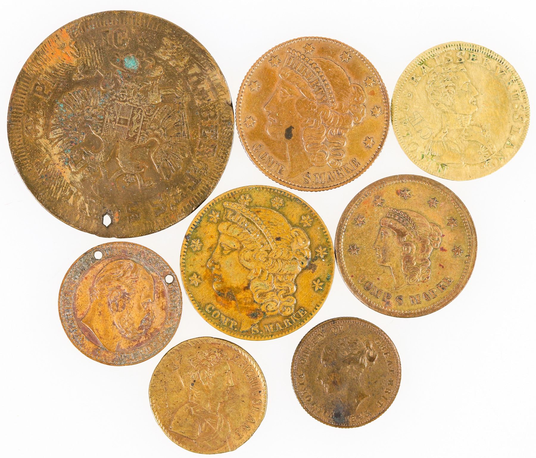 Eight brass counters of unusual and scarce designs: Two brass counters after US $10 gold coin with the face of Liberty on the obverse and an eagle on the reverse; one counter with Liberty on the obverse and a large 50 on the reverse; one large counter with a double-headed eagle on the obverse and // SPIEL / MARKE // on the reverse; another with "Russland" Czar Nicolaus; Kaiser Wilhelm; and three others.