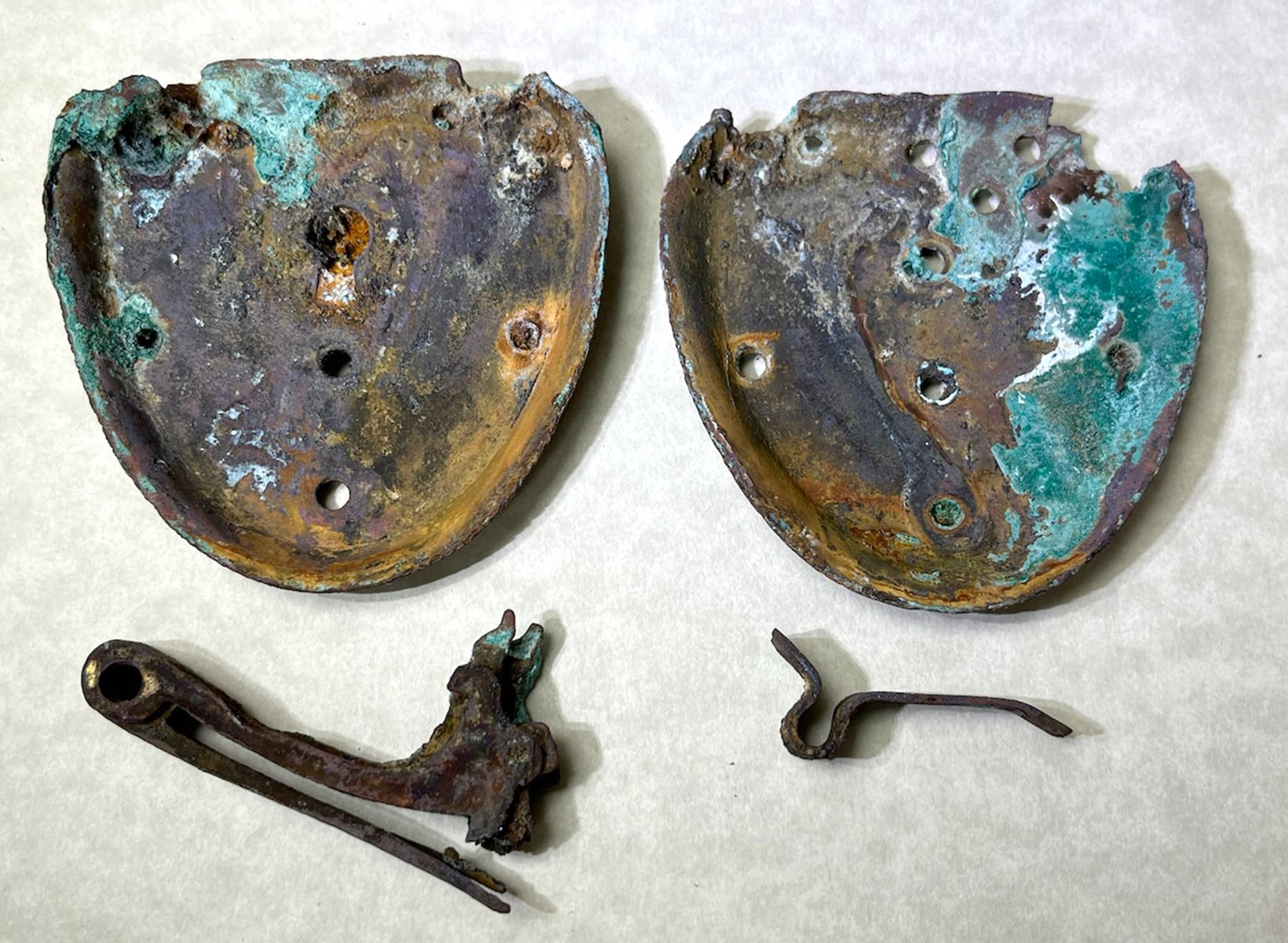 Also, 2 small brass swivel covers or tags. These could have been used to cover holes for a latch, or as small fobs or tags, but they are unengraved.
